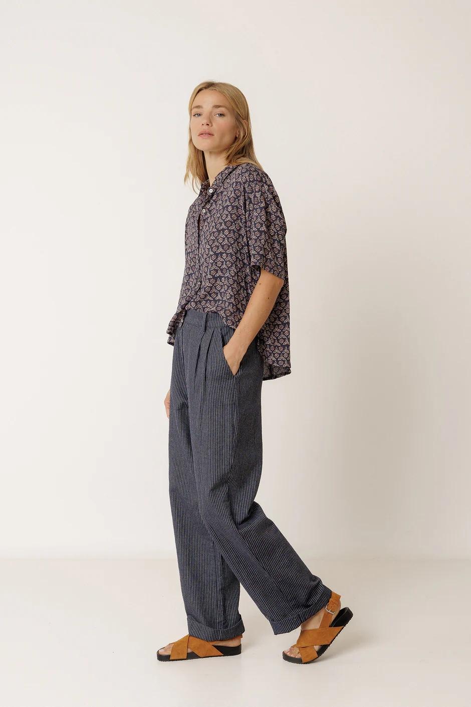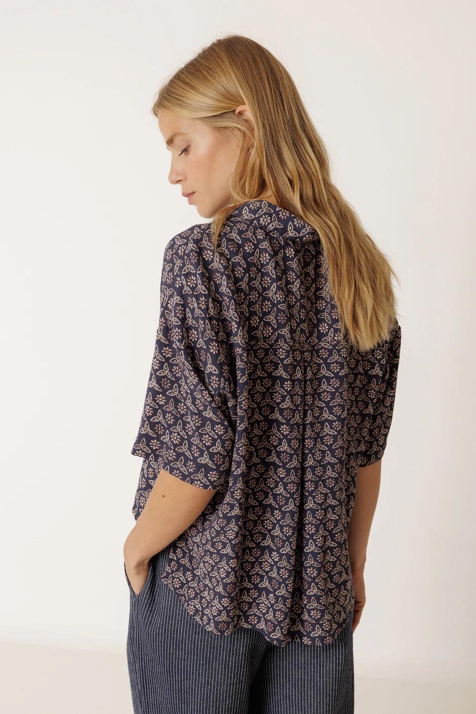 Camisa oversize en viscosa sostenible, con un estampado tipo blockprint disponible en tres combinaciones de color. ¿Con cuál de ellas te vas a quedar?
