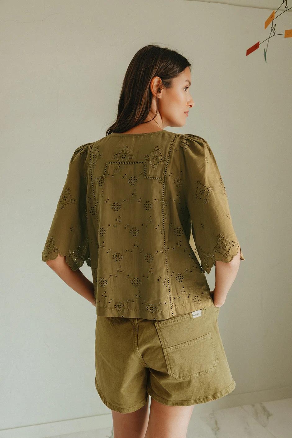 Camisa romántica con manga tres cuartos y acabado ondeado en festón. La puedes combinar con la falda de la misma serie para crear un efecto vestido, o con cualquiera de nuestros pantalones denim para un look más casual.