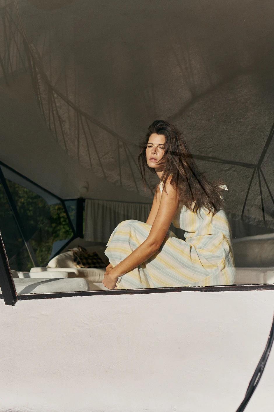 Maxi vestido en algodón de rayas con escote en pico y espalda ajustable mediante lazada. Tiene silueta ajustada y falda acampanada que estiliza y hace que sea una prenda muy liviana.