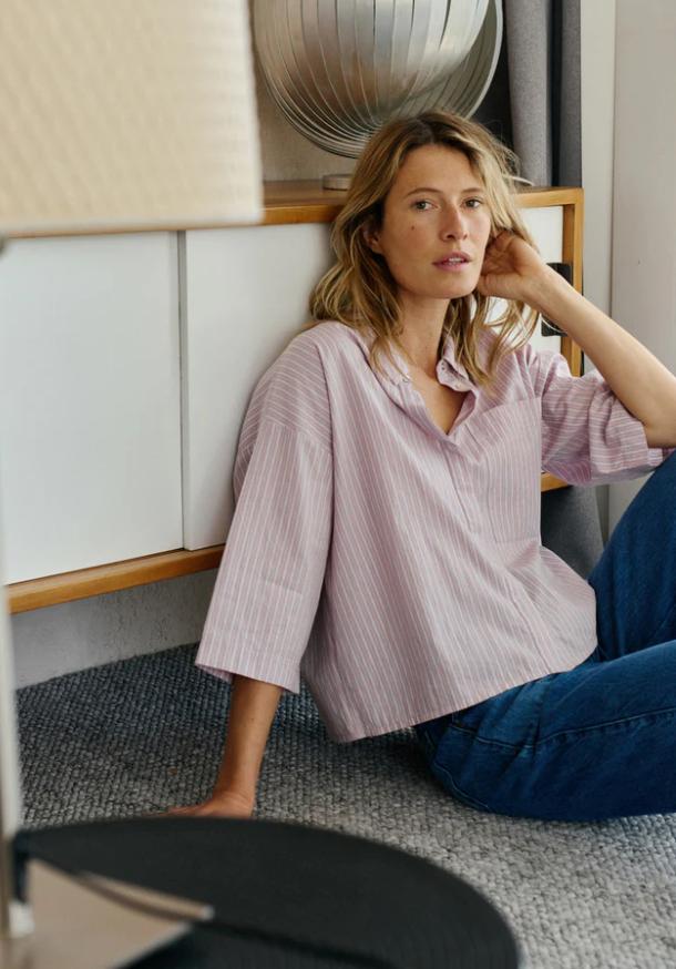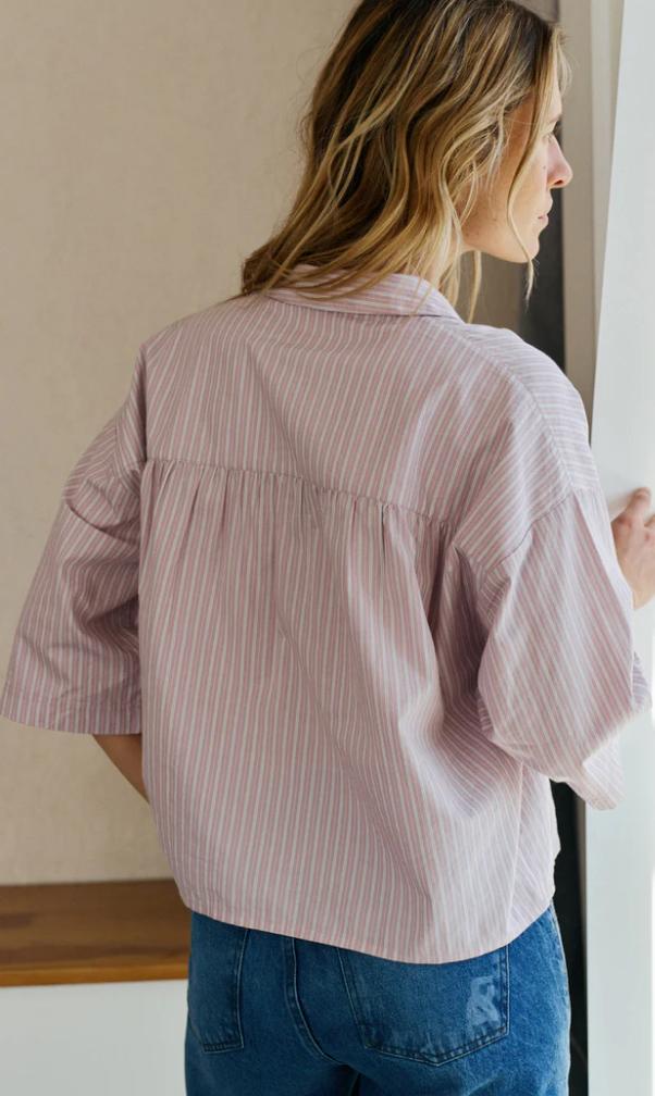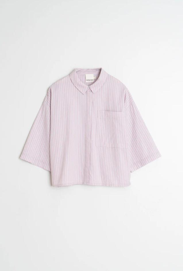 Una camisa de rayas clásica pero en versión crop. Una prenda renovada con corte cuadrado, hombro caído y manga corta holgada. El algodón popelín le da un aspecto más actual.