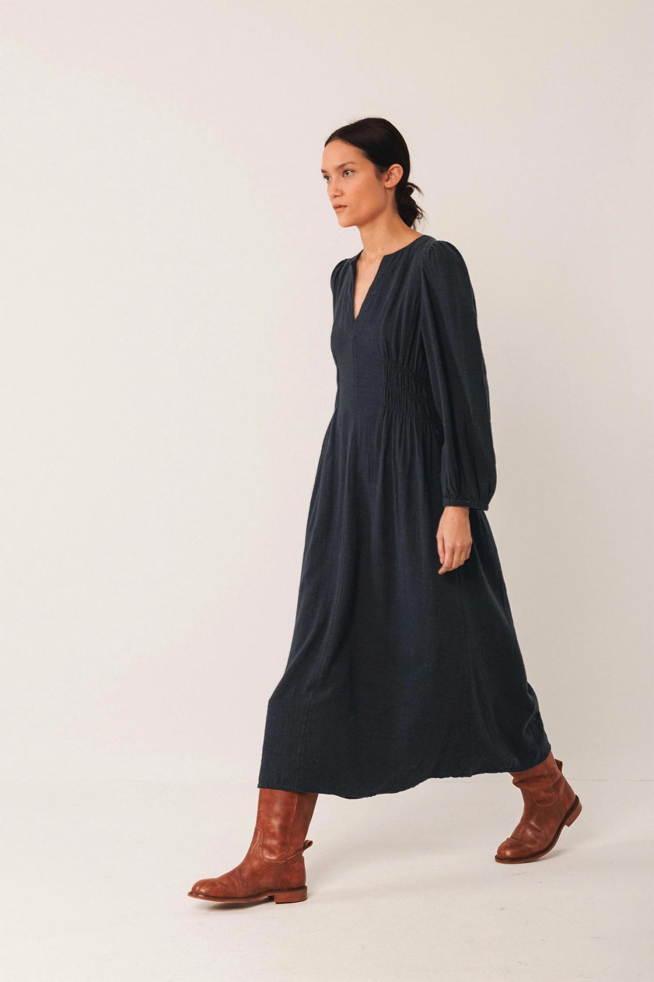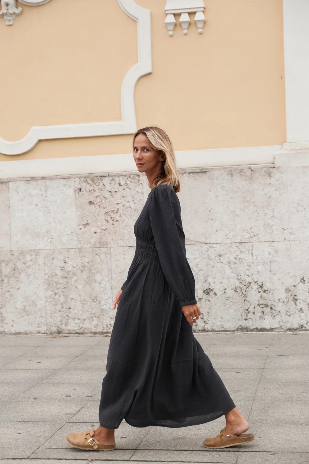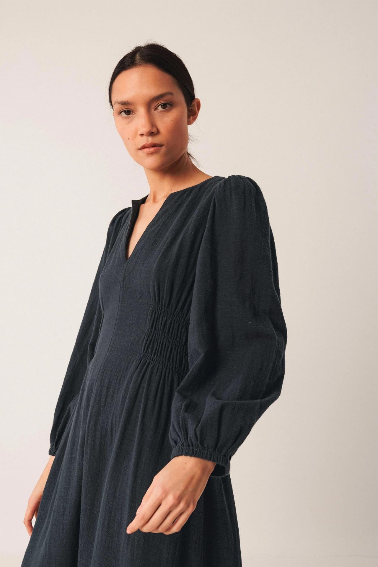 Vestido en gasa de algodón crepado, manga con mucho volumen y laterales de cintura engomados para ajustar a la silueta.