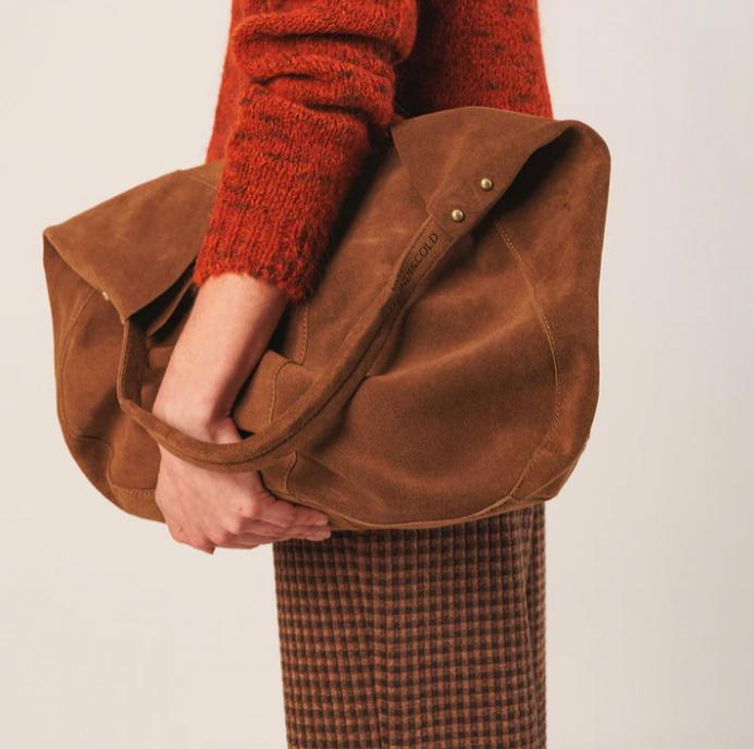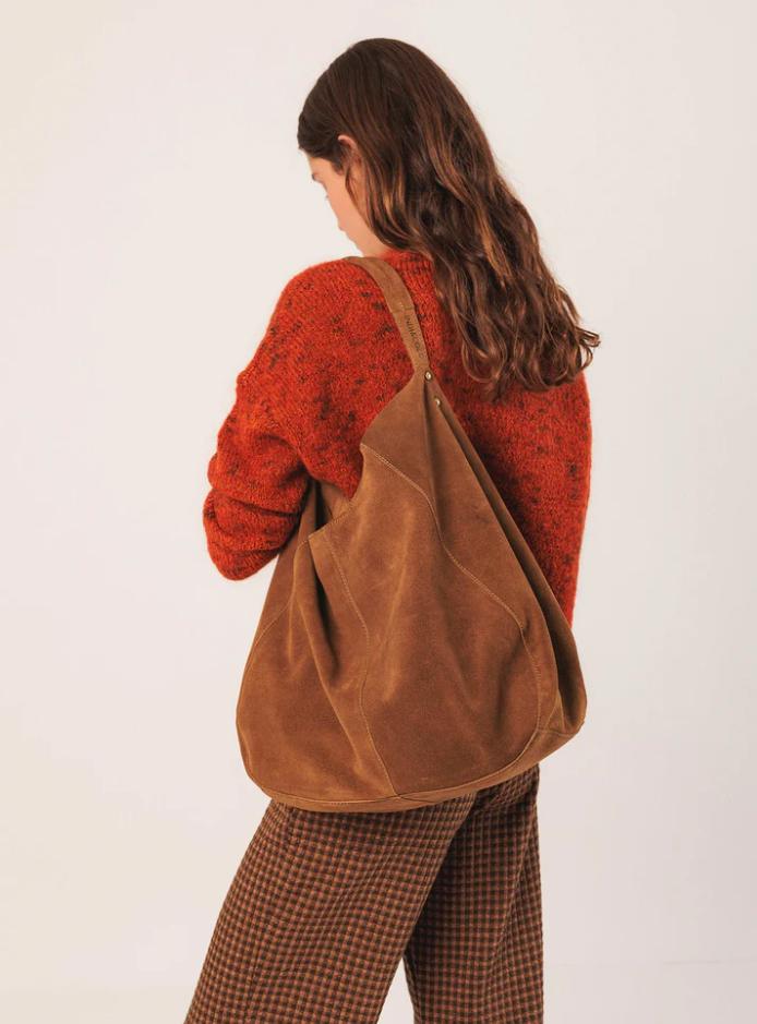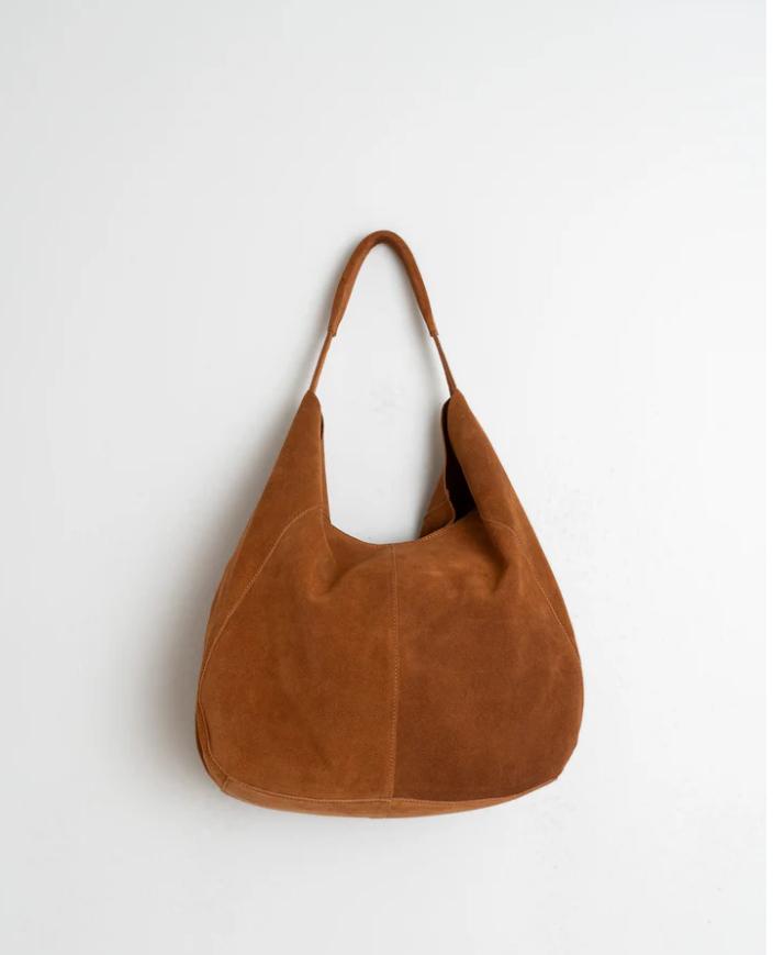 Bolso tote con asa de mano/hombro en piel de serraje sin forrar con bolsillo de parche y cierre de cremallera que hace que sea más blando y fácil de usar.