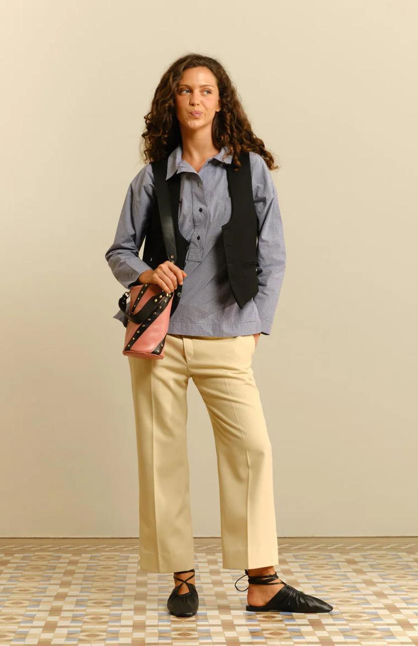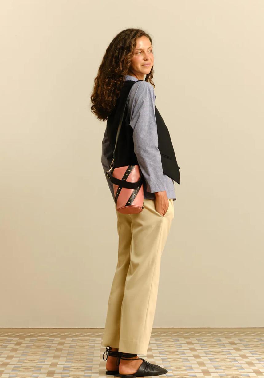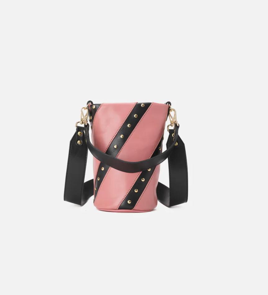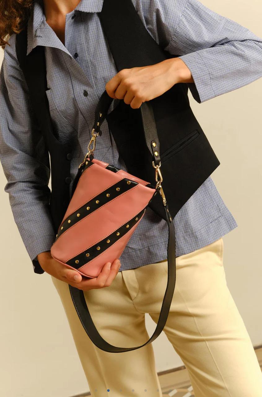 Bolso pequeño de piel con franjas negras con tachuelas doradas. El Candy Twist es un bolso ligero y cómodo y gracias a sus dos asas anchas de piel (corta y larga) podrás llevarlo en cualquier ocasión, sea de día o de noche.