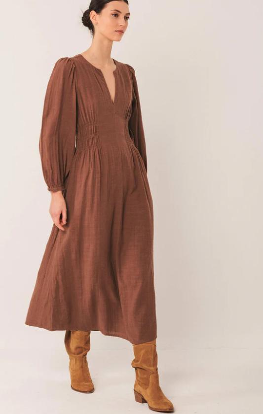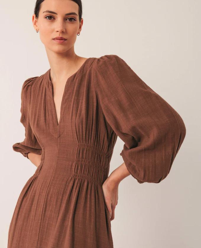 Vestido en gasa de algodón crepado, manga con mucho volumen y laterales de cintura engomados para ajustar a la silueta.