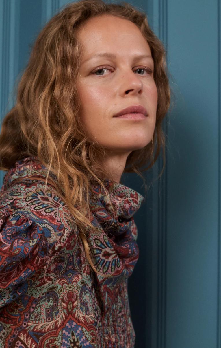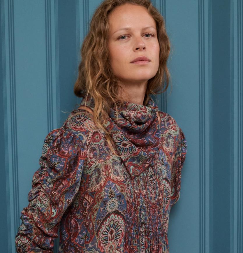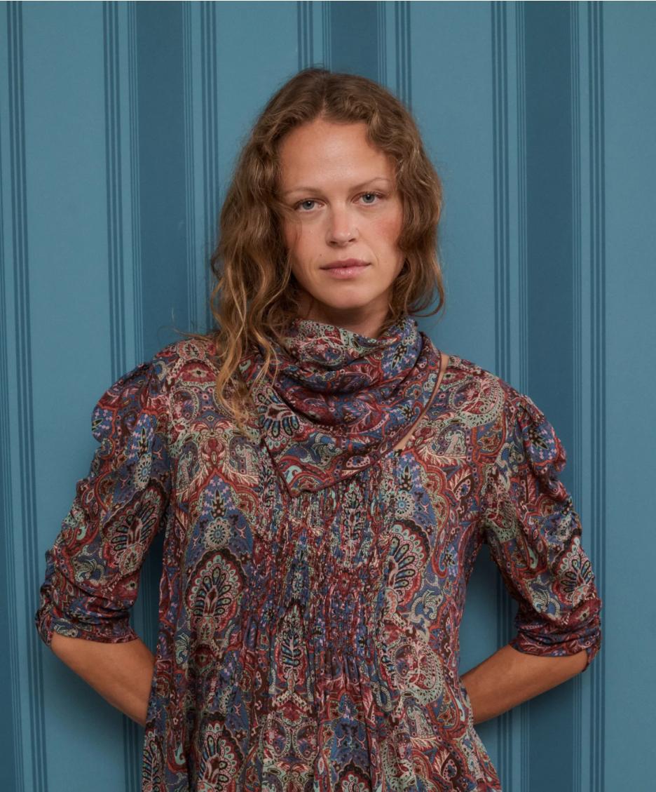 El tejido es un paisley en tonos marrones, azules , granates, rosas. Un complemento perfecto y super combinable.