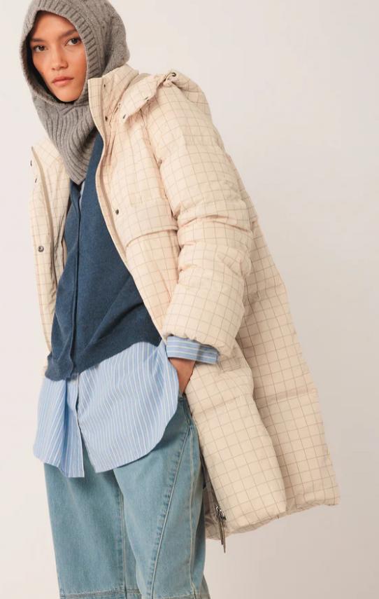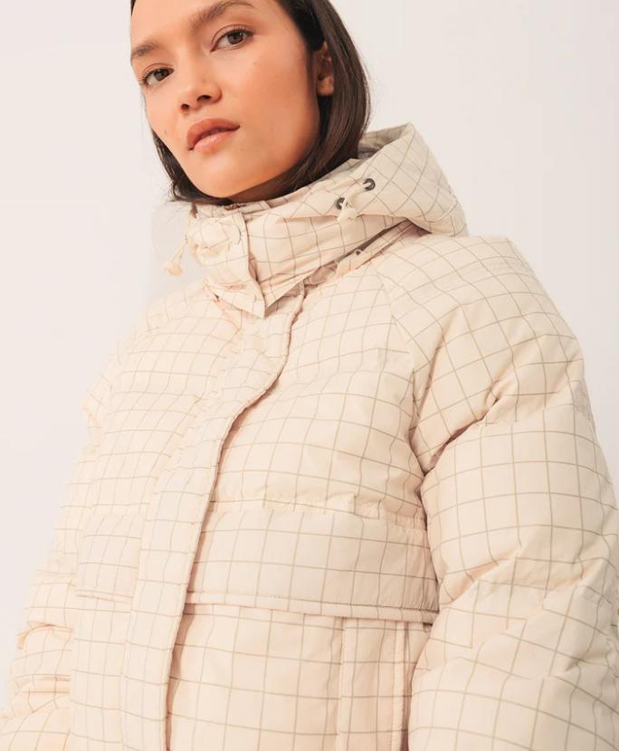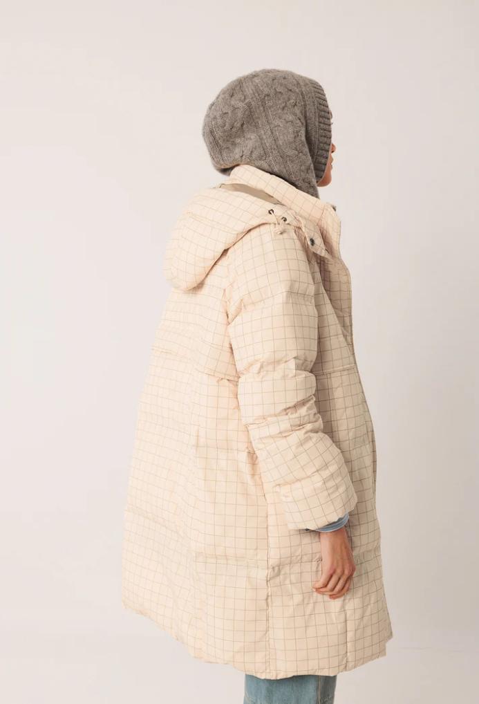 Plumífero con relleno de plumón, tejido de cuadros y capucha extraíble, largo 3/4. Tiene cierre de doble cremallera y botones de snap con bolsillo de ojal en la parte frontal de doble abertura.