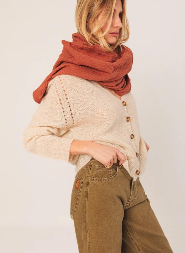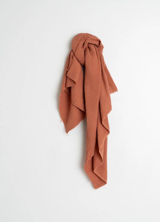 • Fular básico de doble gasa y tinte en prenda • Dimensión: 80cm de ancho x 170cm de largo.