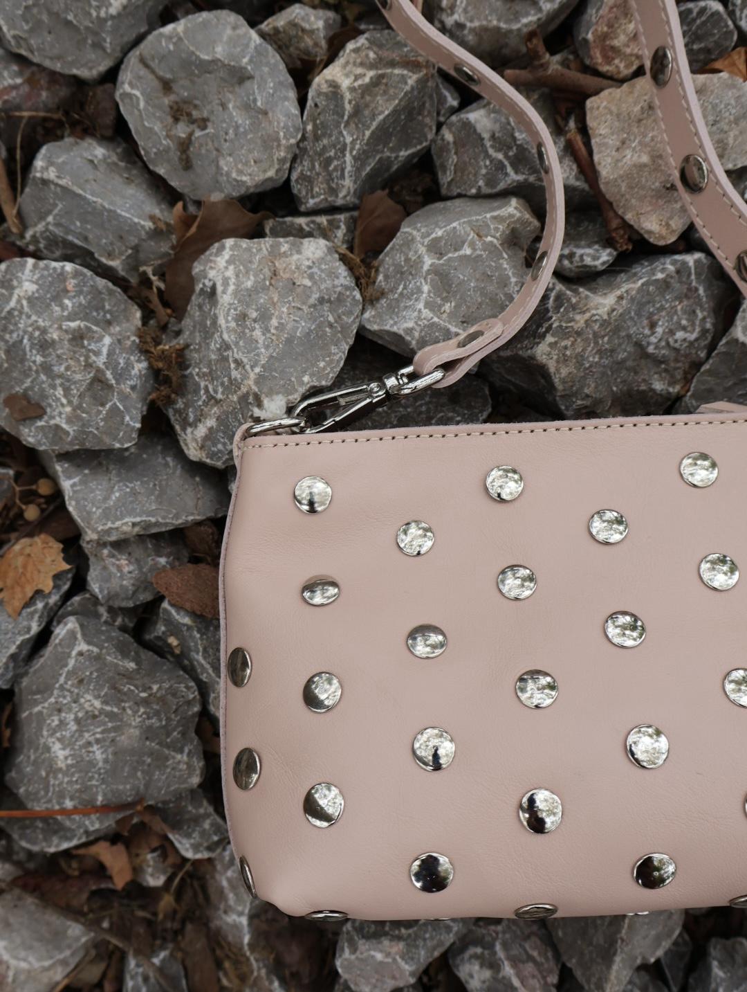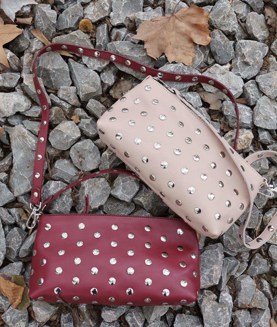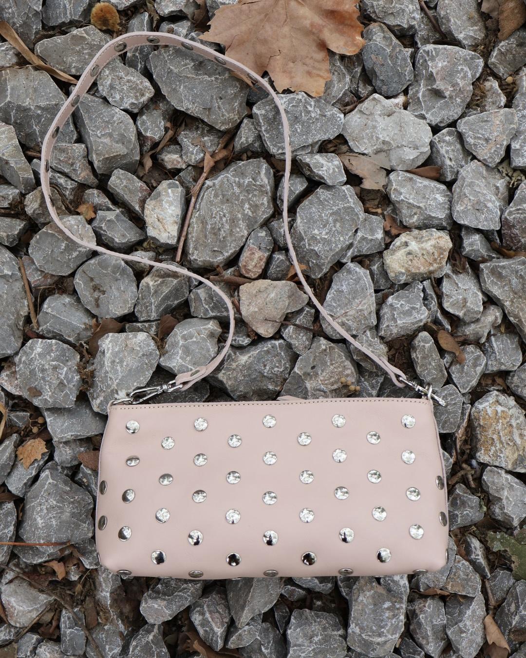 Bolso pequeño de piel en forma de baguette con remaches,elegante y versátil.