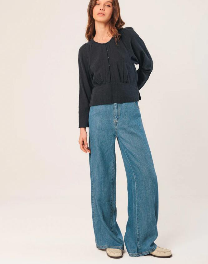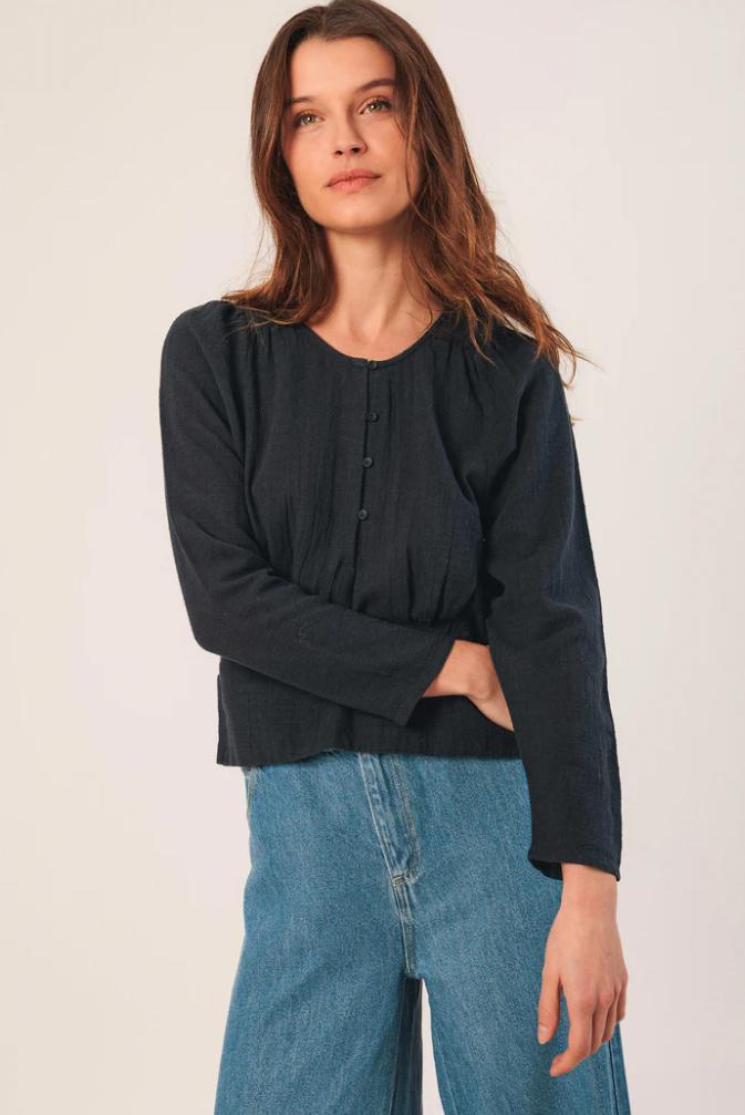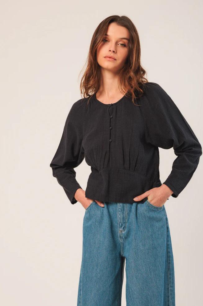 Una blusa corta con silueta súper femenina. Su manga jamón y corte en cintura hacen que la parte del talle sea amplio y ajuste en la cintura. En gasa de algodón crepado.