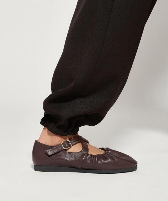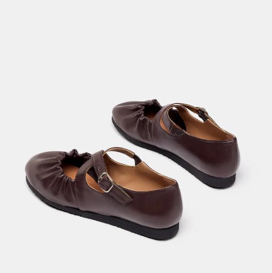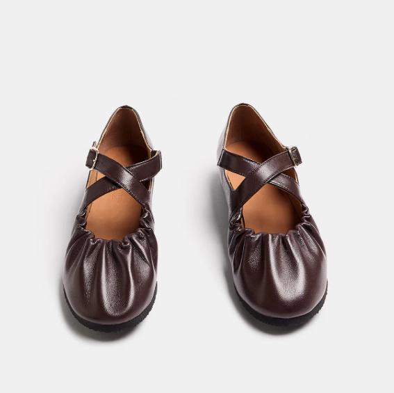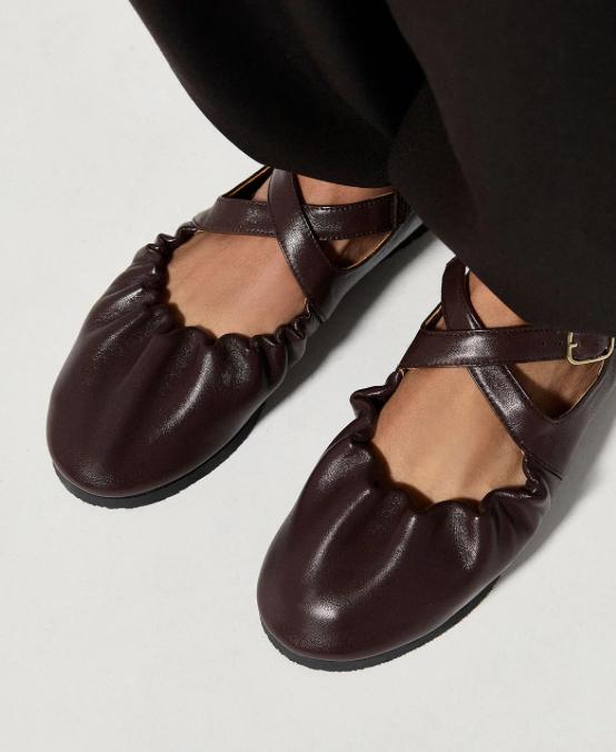 BEC es un zapato tipo bailarina con correas cruzadas en el empeine y puntera fruncida. El material de corte y forro es de piel de ovino. Cierre mediante correa con hebilla. Plantilla acolchada y forrada con piel de vacuno natural. La suela es de goma virgen con cuña. Puntera redonda. Altura de suela 2 cm. Fabricado en España