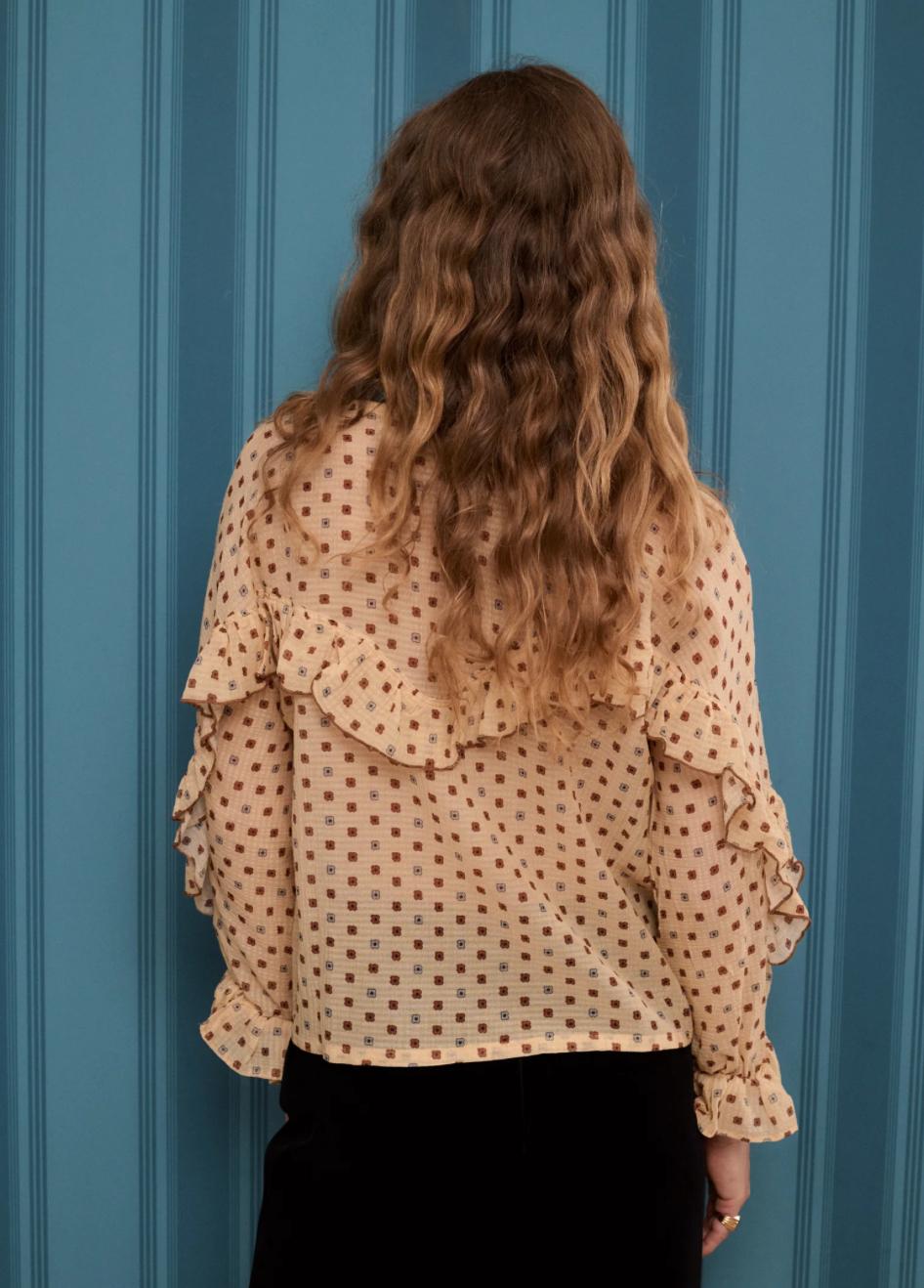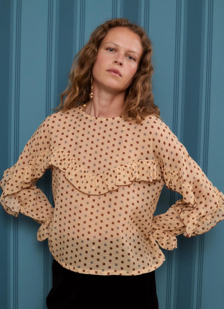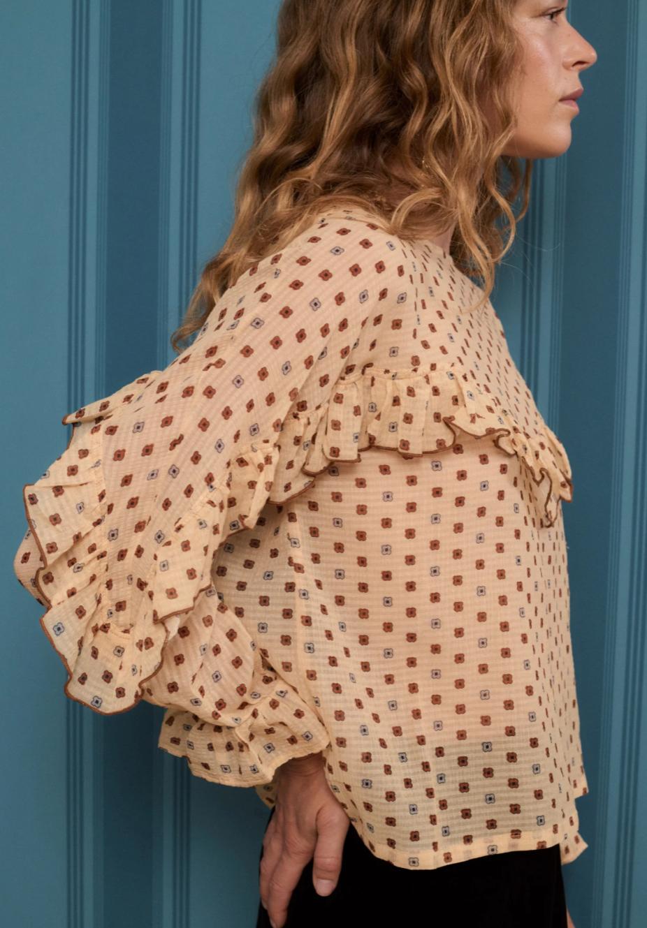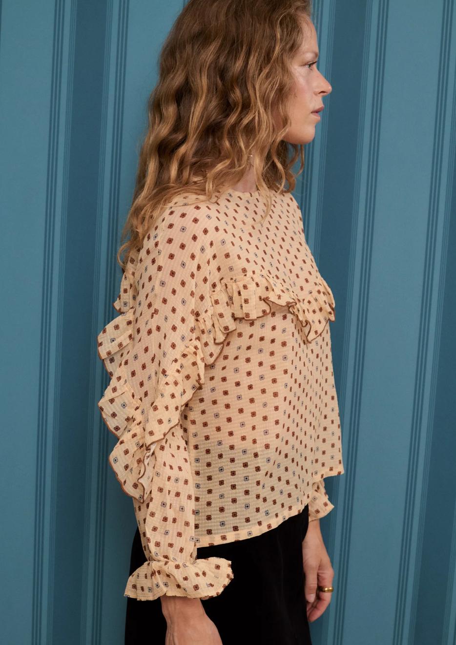Blusa de manga larga estampada con dibujo de pequeña flor color crema y camel, realizada con hilaturas de algodón y seda en un tejido muy fluido y agradable.