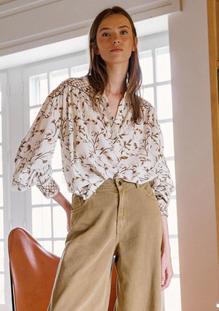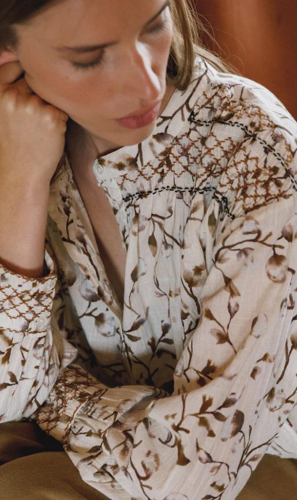 • Cuello redondo con cierre abotonado de media tapeta • Hombro encajado y manga larga con puño y cierre de botón • Detalle de smock manual en la parte frontal de hombros y puños • Tejido de algodón sostenible con print digital de motivo floral • Fit relajado: Diseñado para que siente ligeramente holgado • Medidas sobre talla S en plano: Largo desde hombro 66cm. Ancho de pecho 54cm. Ancho de bajo 64cm. • Tallaje: +1 cm de largo por talla y +2cm en contornos.