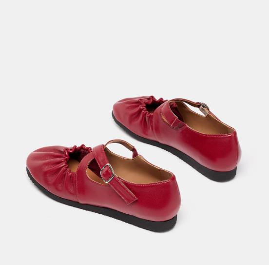 BEC es un zapato tipo bailarina con correas cruzadas en el empeine y puntera fruncida. El material de corte y forro es de piel de ovino. Cierre mediante correa con hebilla. Plantilla acolchada y forrada con piel de vacuno natural. La suela es de goma virgen con cuña. Puntera redonda. Altura de suela 2 cm. Fabricado en España