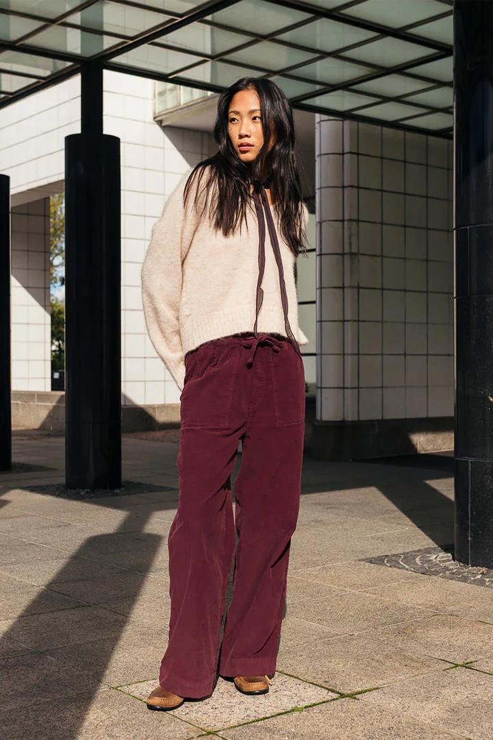 • Cintura elástica con cordón ajustable • Pernera recta con caída fluida • Tejido de pana 100% algodón • Fit relajado: Diseñado para que siente ligeramente holgado • Medidas sobre talla 36 en plano: Cintura: 33cm. Largo de tiro: 31cm. Largo de entrepierna: 72cm. Tallaje aproximado: +1 cm de largo por talla y +2 cm en contornos.
