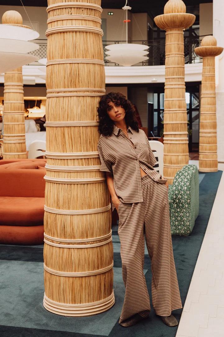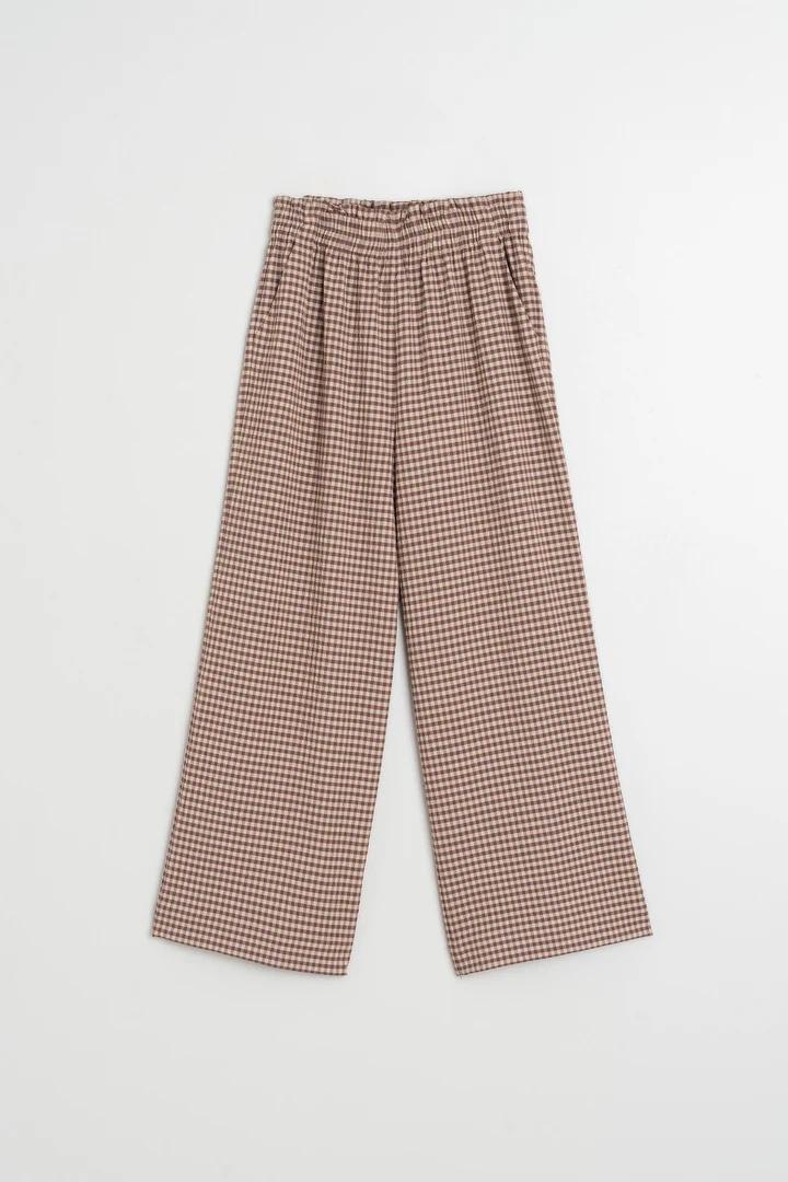 Pantalón de talle alto con cintura engomada y fit relajado. Es perfecto para ir arreglada y cómoda a la vez, su tejido en falso liso con viscosa y cuadro mini te van a encantar.
