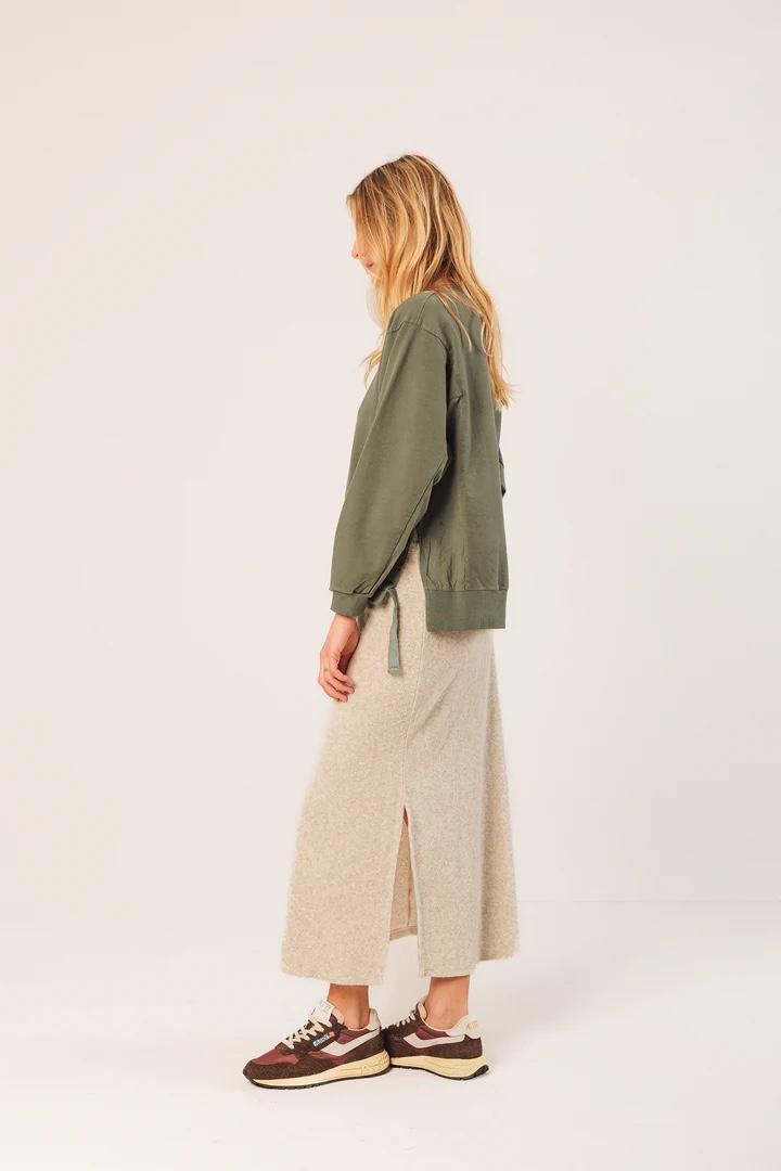 • Cintura engomada • Abertura lateral • Tela de rizo de algodón • Regular fit: Diseñado para llevar un fit estándar • Medidas sobre talla 36 en plano.Cintura: 33,5cm.Largo total de prenda: 88cm. • Tallaje: cada prenda aumenta de largo 1 cm por talla.
