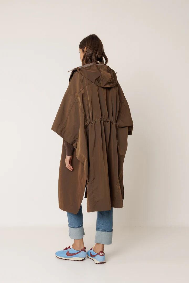 • Cuello alto con capucha. • Hombros caídos, de construcción amplia tipo capa con mangas murciélago. • Tejido técnico repelente al agua con costuras termoselladas. • Fit oversize: Diseñado con un fit más grande de lo habitual. • Medidas sobre talla S en plano: Largo desde hombro 112cm. Largo de manga: 55cm. Tallaje: +1 cm de largo por talla y +2cm en contornos.