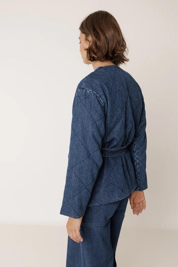 Chaqueta kimono denim acolchado ajustable a la cintura mediante lazada extraíble. Con fit relajado, se puede llevar suelto para hacer un total look con el pantalón de la misma serie.