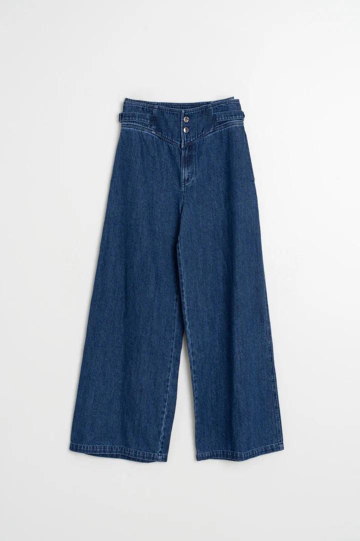 • Tiro alto con cierre delantero de doble botonadura y cremallera. • Canesú delantero y trasero. • Trabillas laterales ajustables. • Bolsillos insertados en costura. • Maxi bolsillos parche traseros. • Pierna ancha y larga. • Fit relajado: Diseñado para que siente ligeramente holgado. • Medidas sobre talla 36 en plano. Cintura: 34cm.