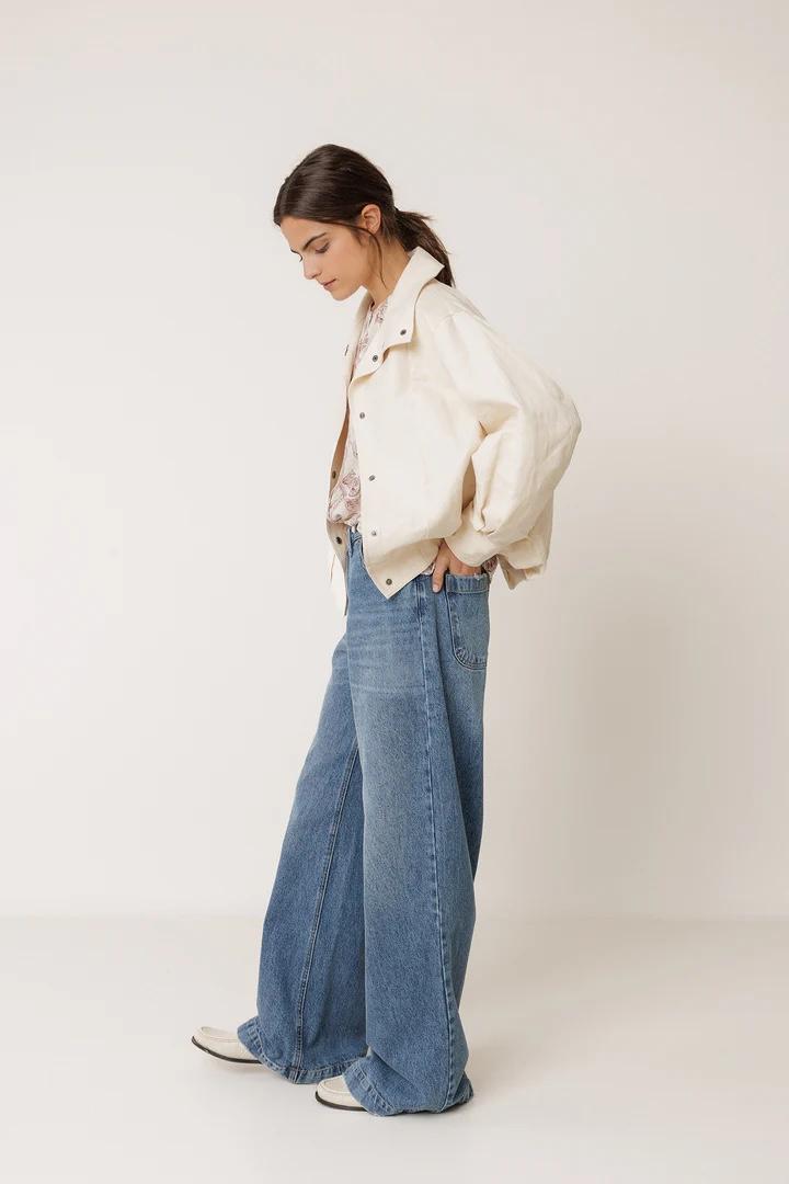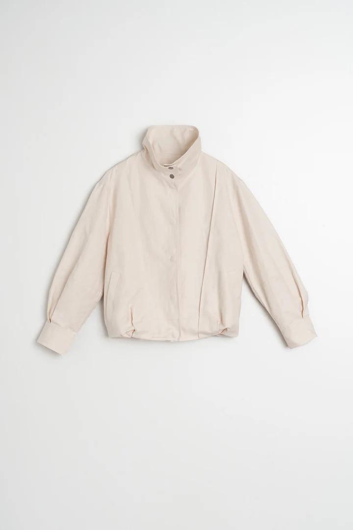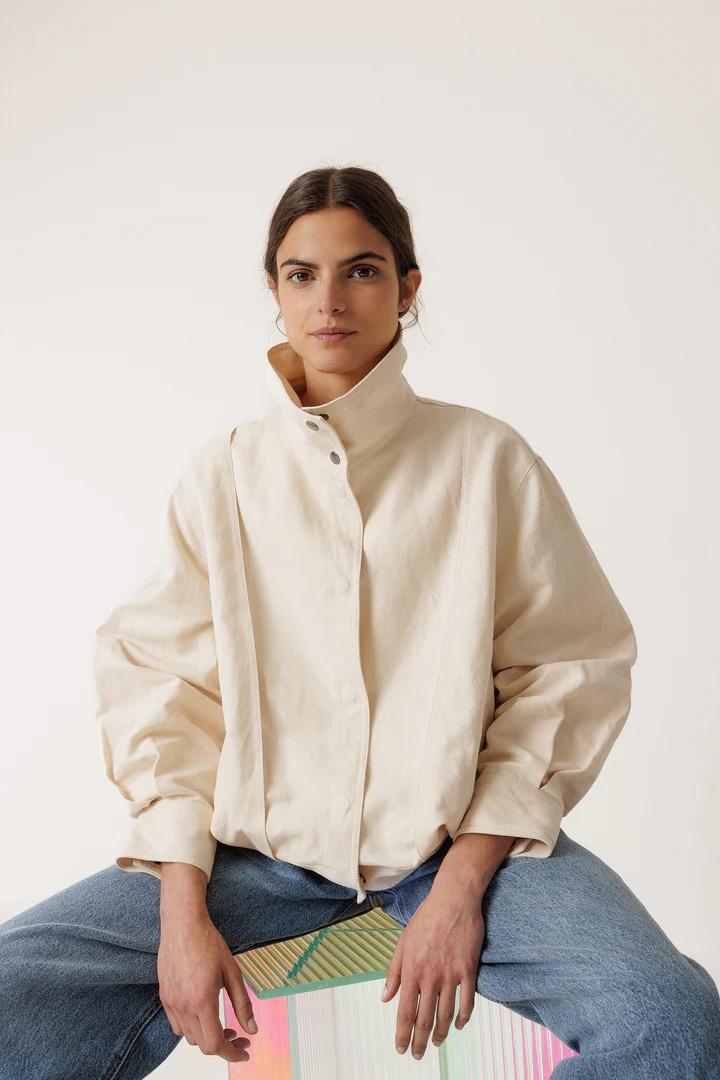 Nuestra cazadora con forma abullonada y cuello alto le da un aire moderno y envolvente. Perfecta para el entretiempo, es una prenda cómoda con estructura, ideal para llevar sobre jerséis finos o camisas.