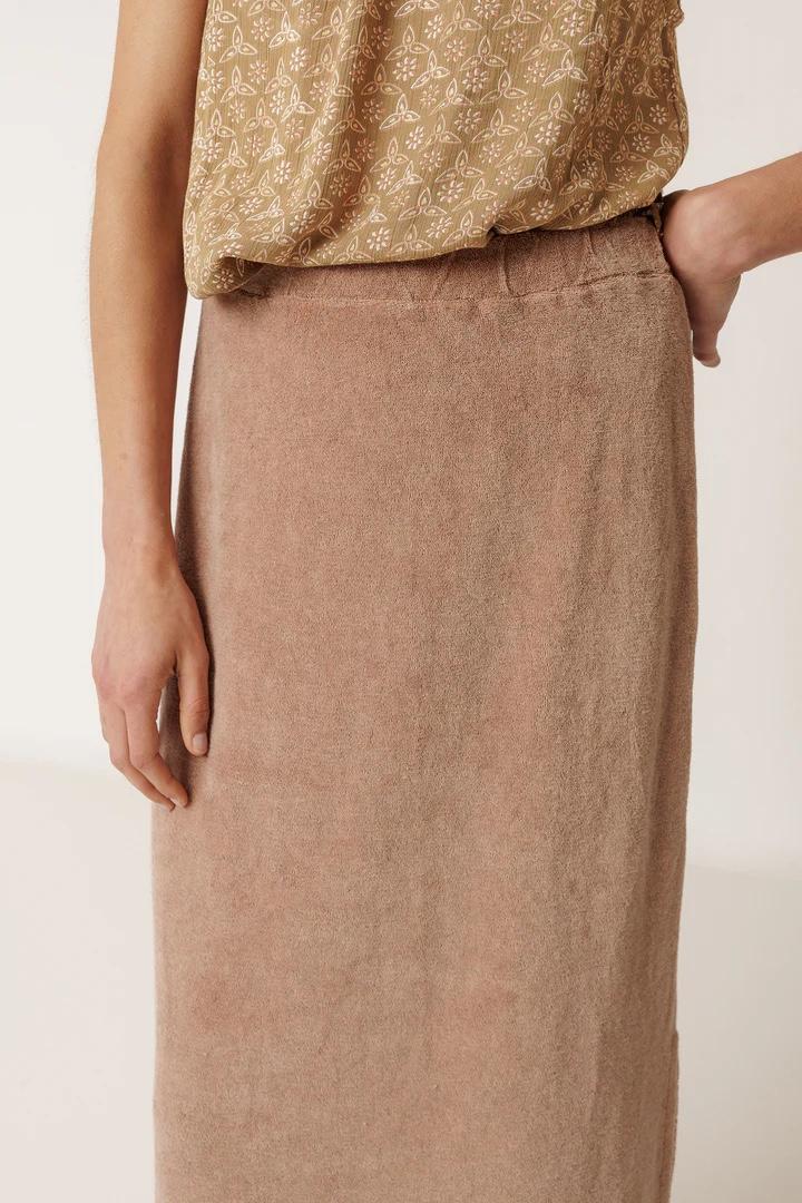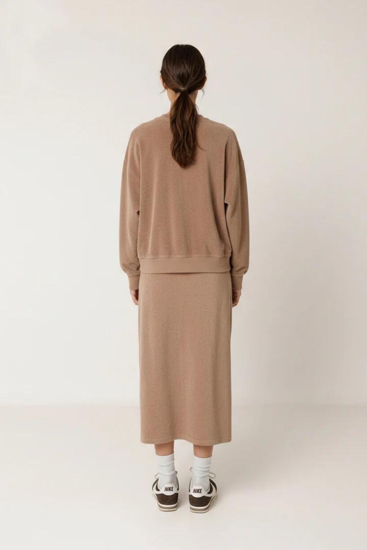 Nos encanta nuestra falda de rizo Mila porque resulta muy cómoda por su cinturilla de goma y la elasticidad de su tejido. La puedes combinar con el top o con el jersey Lara del mismo tejido para conseguir un total look ideal.