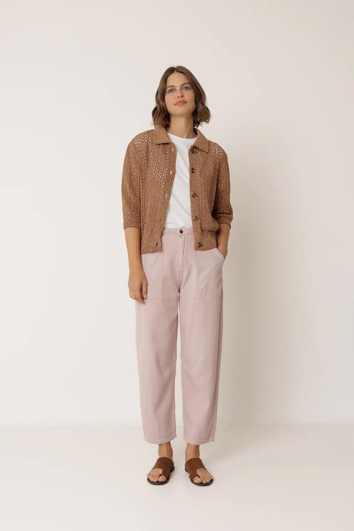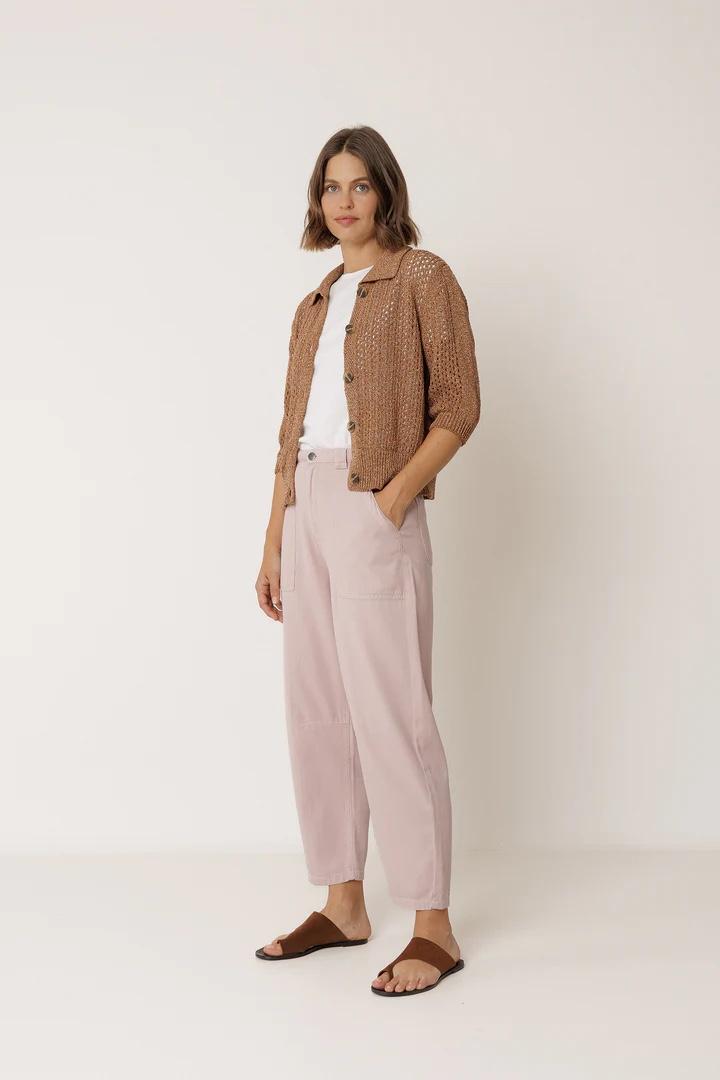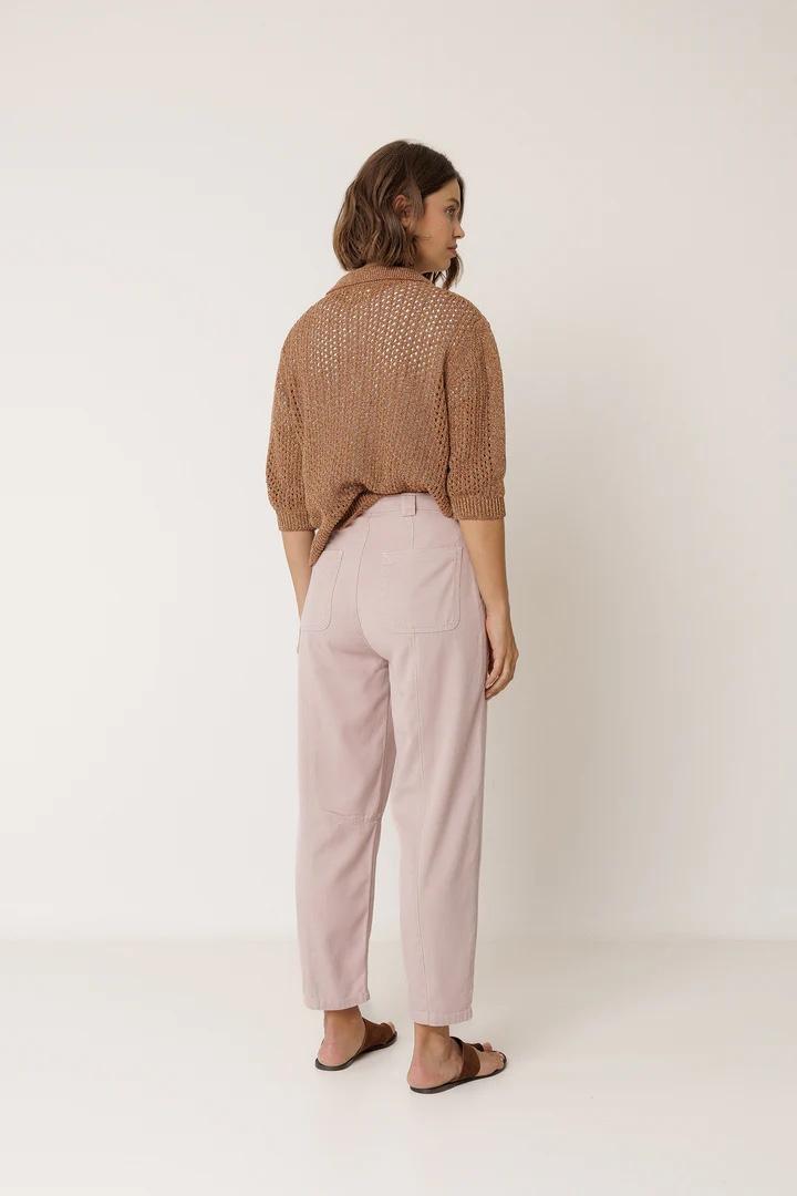 Un pantalón con forma carrot que combina comodidad y diseño. El detalle de los bolsillos y la costura frontal aporta un toque especial, ideal para combinar con la cazadora de la misma serie.