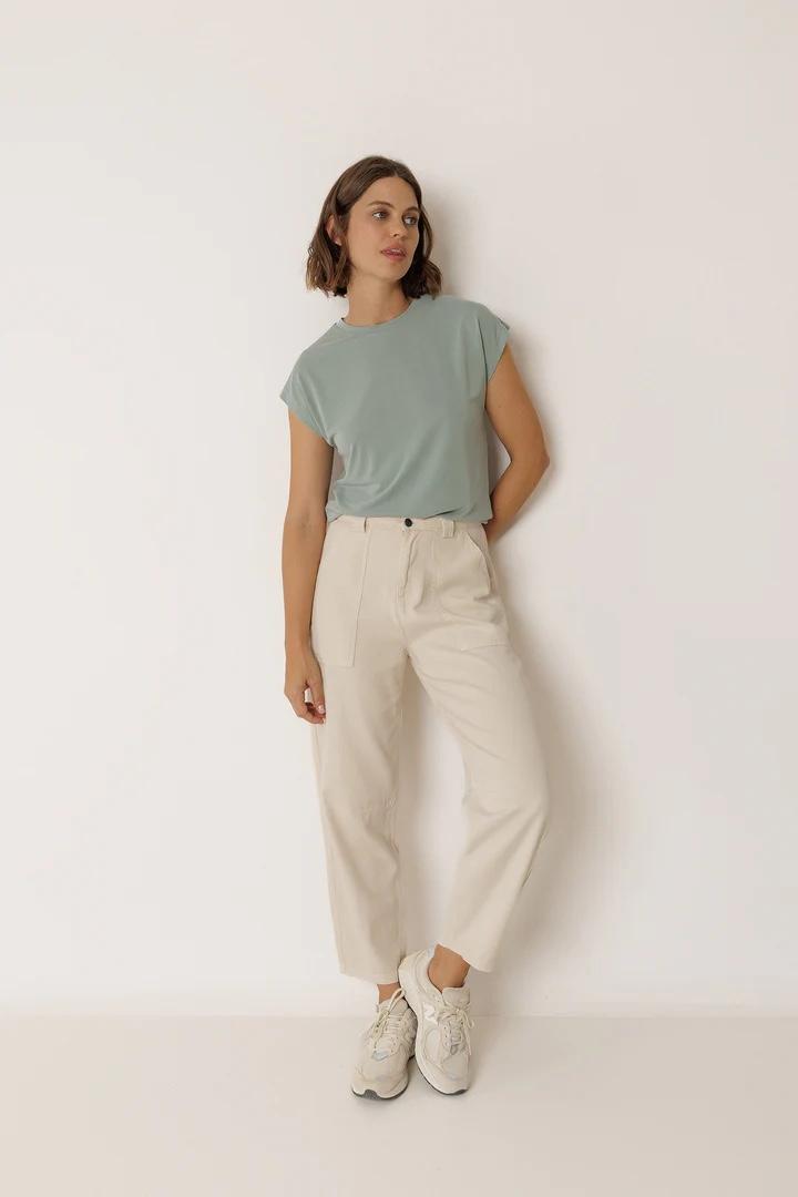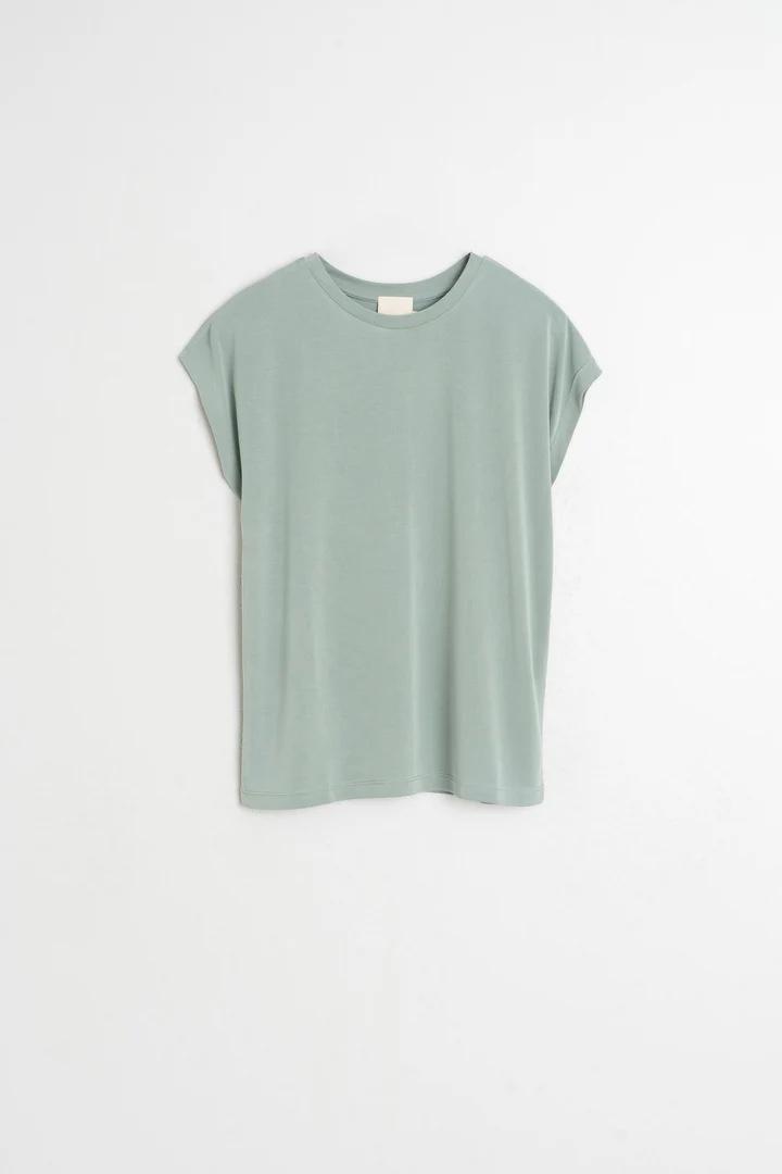 Camiseta básica de hombro caído y cuello caja, en tejido de modal. Súper liviano, con mucha caída y muy confortable para los días de calor.
