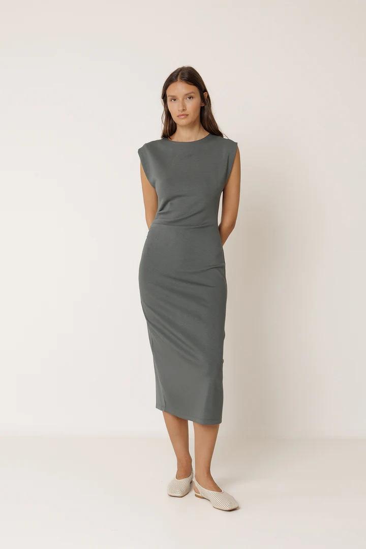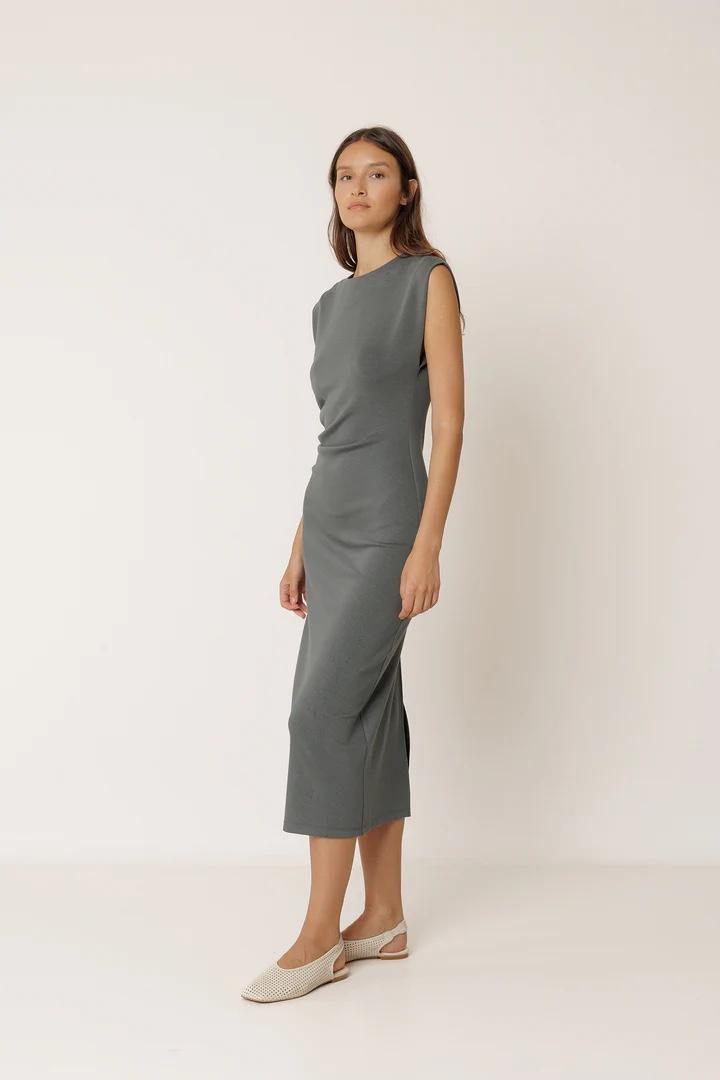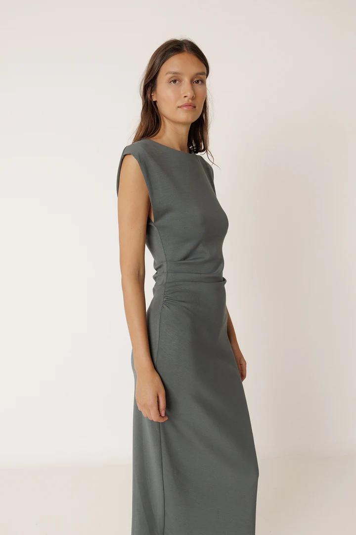 Vestido largo confeccionado en tejido fluido. Tiene escote caja con el hombro ligeramente caído y una abertura trasera. Es uno de los vestidos más sofisticados de nuestra colección gracias al detalle de los pliegues de la cintura.