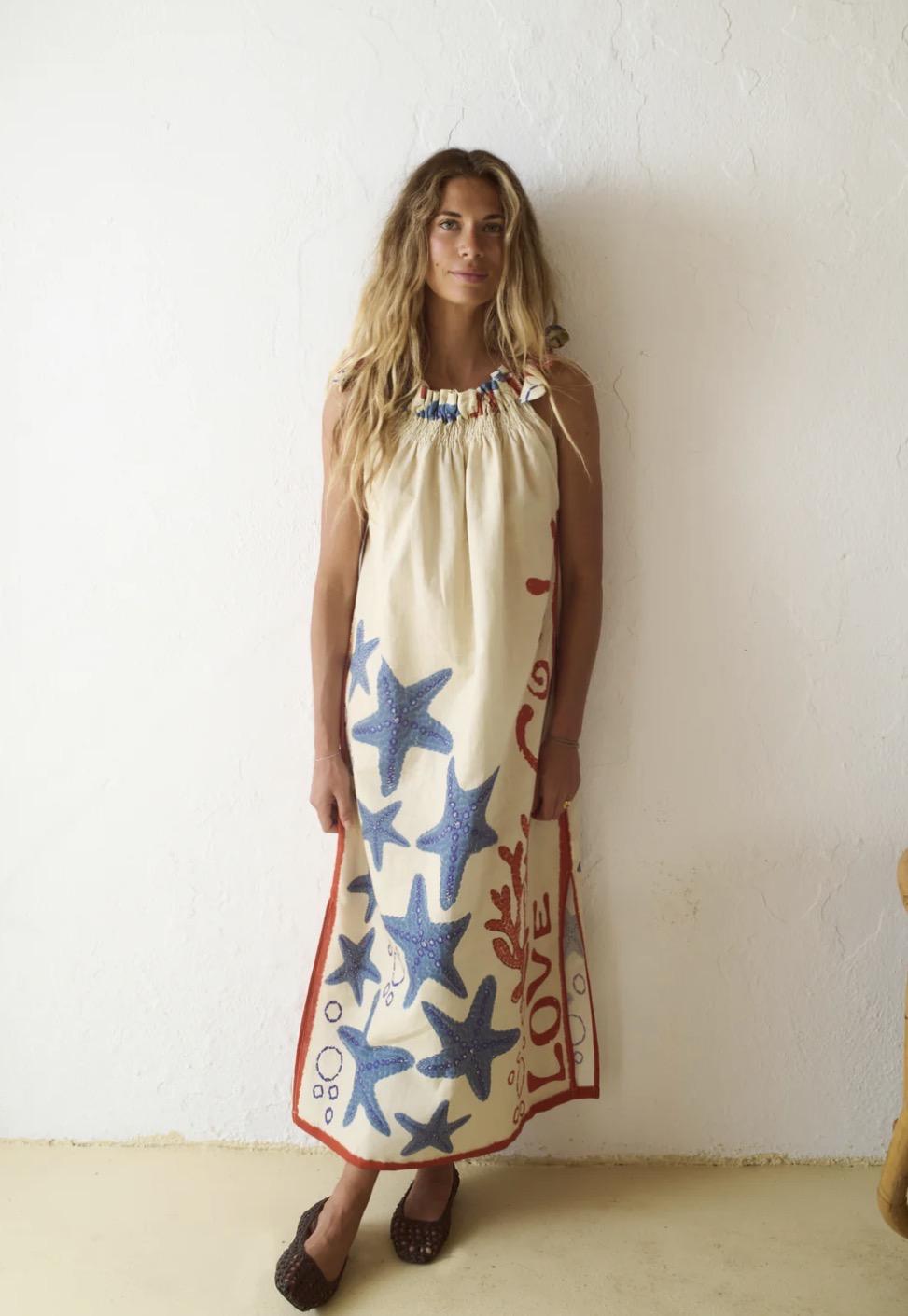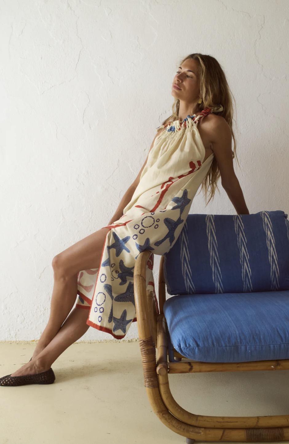 Vestido de largo medio con estampado gráfico de inspiración marina. El print combina motivos figurativos de estrellas de mar con elementos circulares y trazos orgánicos, distribuidos de manera amplia. La paleta cromática se articula en azul, rojo y crema, generando un contraste marcado y una composición muy bonita y especial.