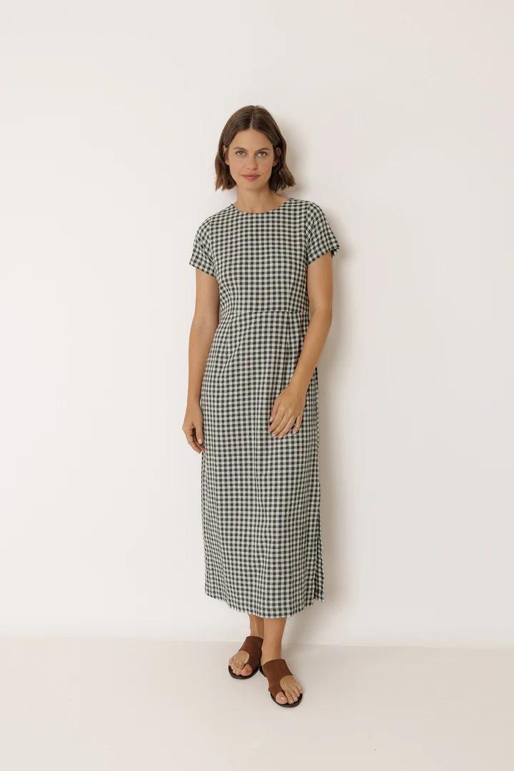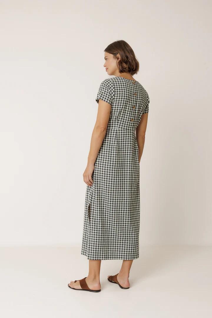 Vestido largo de algodón en cuadro vichy con cuello redondo y cierre abotonado en la parte trasera. Tiene corte en la cintura y falda lápiz con un fit slim, diseñado para llevar ajustado.