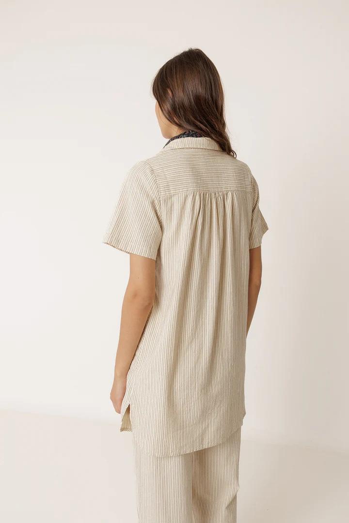 • Cuello polo con cierre de botones. • Manga corta y maxibolsillos parche. • Pequeñas aberturas laterales en el bajo. • Tejido de rayas en algodón orgánico. • Fit relajado: Diseñado para que siente ligeramente holgado. • Medidas sobre talla S en plano: Largo desde hombro cm. Ancho de pecho cm. Ancho de bajo cm. • Medidas sobre talla S en plano: Largo desde hombro.