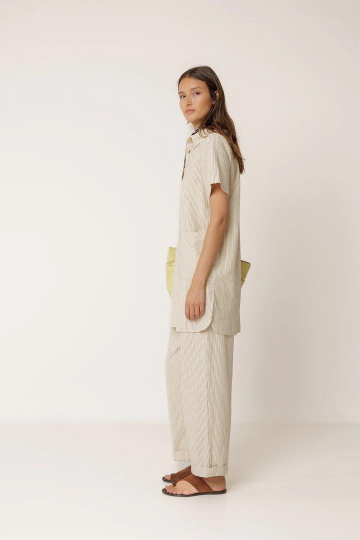 Vestido relajado de raya diplomática con cuello polo y cierre de botones. Una prenda muy versátil que puedes usar como vestido corto o como una camisa larga.