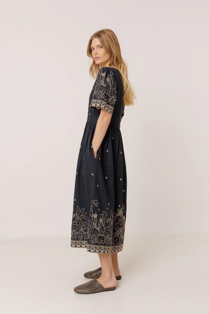 • Cuello de pico con cierre trasero de botones. • Hombro encajado y manga corta amplia con bordado floral y cenefa. • Corte en cintura. • Largo con bordado en el bajo. • Bolsillos insertados en costura. • Fit relajado: Diseñado para que siente ligeramente holgado. • Medidas sobre talla S en plano: Largo desde hombro 120cm. Ancho de pecho 45cm. Ancho de bajo 75cm. Tallaje: +1 cm de largo por talla y +2cm en contornos.