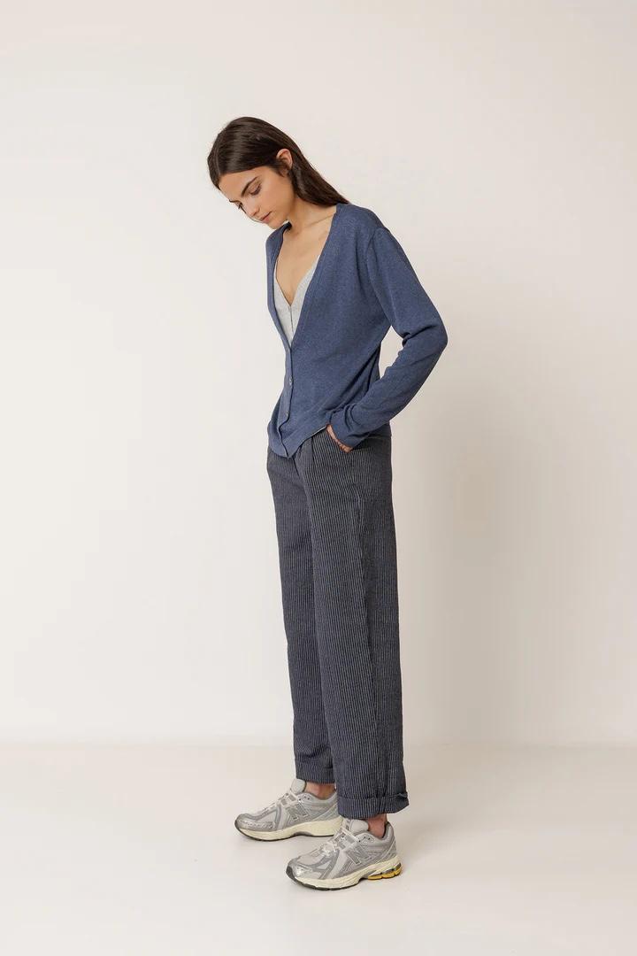 Nuestra chaqueta de punto con efecto de doble prenda, resulta muy cómoda por la caída que tiene su tejido. Con escote en V y remates de canalé, lo puedes llevar sin nada más por debajo y conseguir un look perfecto.