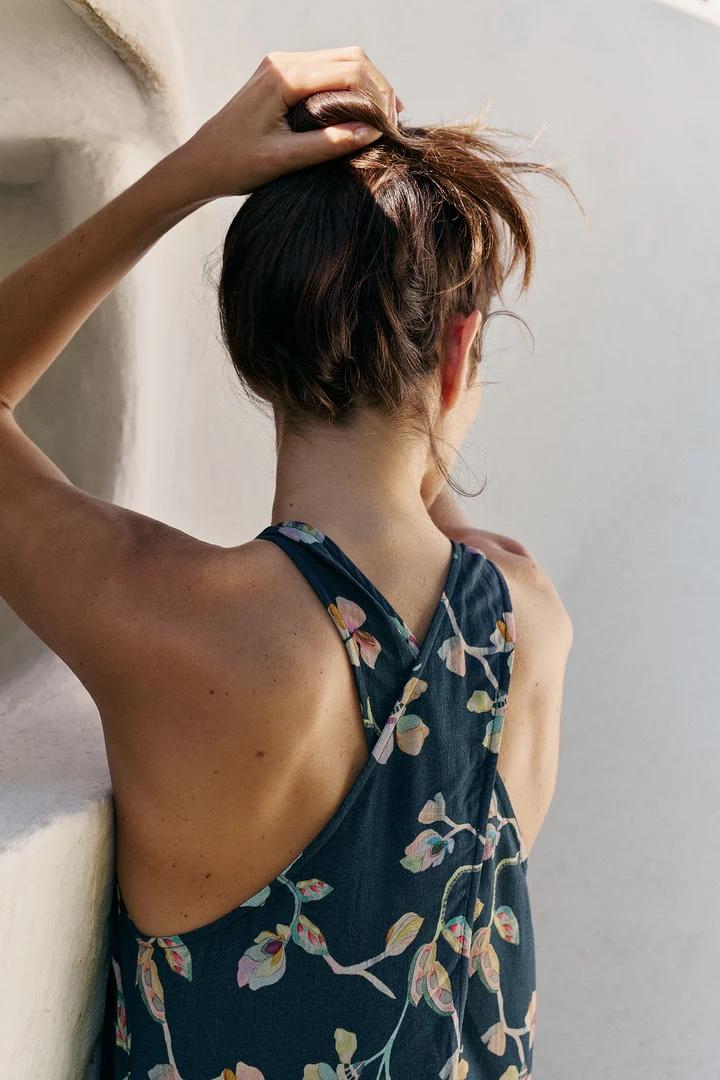 • Cuello redondo y escote cruzado en la parte trasera • Bolsillos ocultos en costura • Tejido de viscosa sostenible con print de motivo floral • Fit relajado: Diseñado para que siente ligeramente holgado • Medidas sobre talla S en plano: Largo desde hombro 135cm. Ancho de pecho 43cm. Ancho de bajo 98cm. Tallaje: +1 cm de largo por talla y +2cm en contornos.