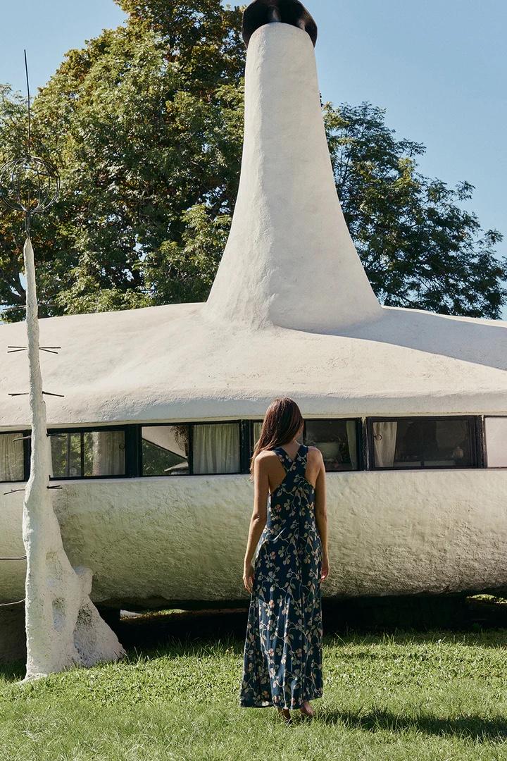 Maxi vestido de escote cruzado en la espalda. Ajustado en la parte superior y con vuelo en bajo. Realizado en tejido de viscosa sostenible con print floral.