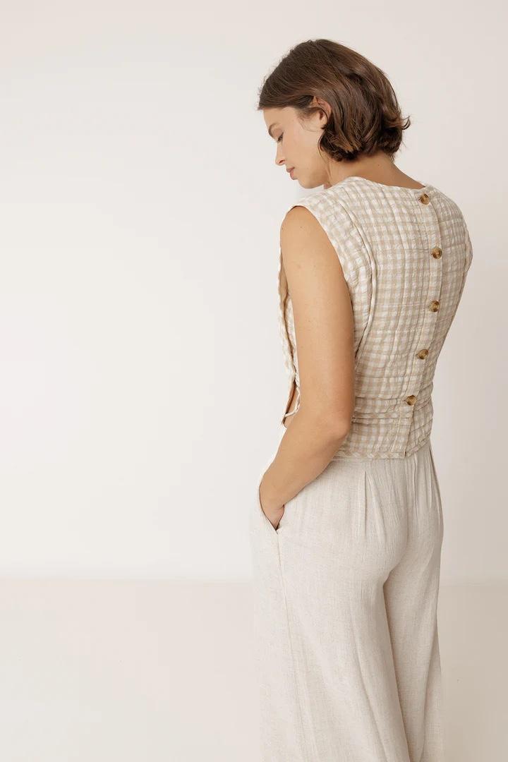 Un top diferente gracias al detalle decorativo en los costados. Su tejido acolchado de cuadros y forma estructurada lo convierten en una prenda ideal, ¡Perfecto para combinar con su pantalón a juego o con lo que tú quieras!