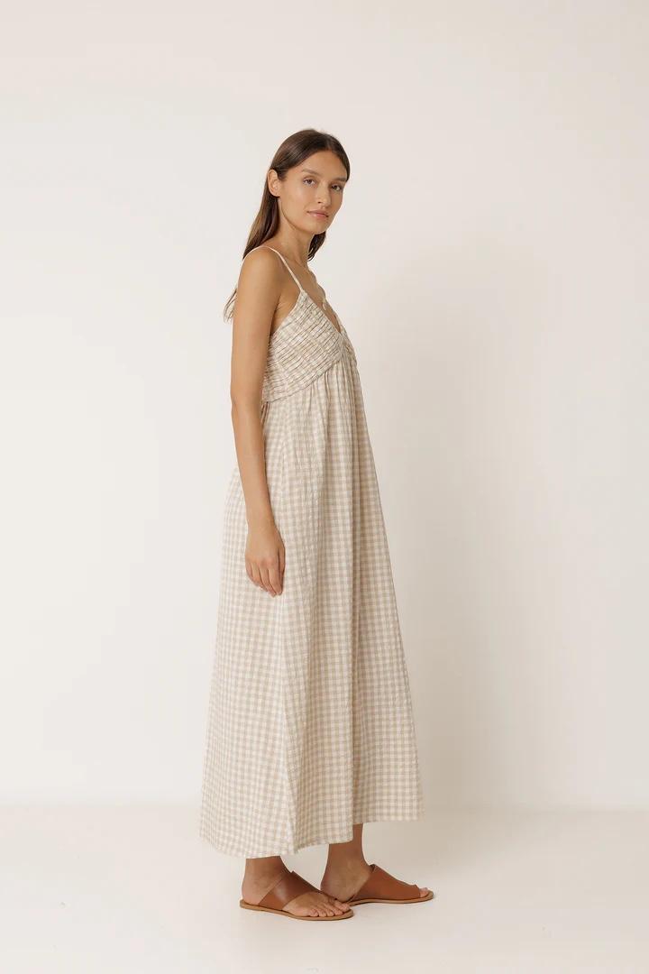 • Escote en forma de V con detalle fruncido y cierre de cremallera trasera. • Bolsillos ocultos insertados en costuras laterales. • Tejido fluido con mezcla de algodón-lino-viscosa en cuadro vichy. • Fit relajado: Diseñado para que siente ligeramente holgado. • Medidas sobre talla S en plano: Largo desde hombro 120cm. Ancho de pecho 39cm. Ancho de bajo 86cm. Tallaje: +1 cm de largo por talla y +2cm en contornos.