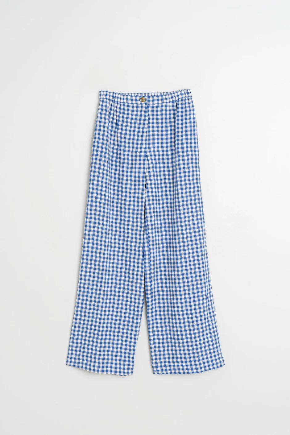 Pantalón de talle medio con cintura engomada. Tiene pernera ancha para mayor confort y su tejido de algodón en cuadro vichy lo convierte en el pantalón del verano.