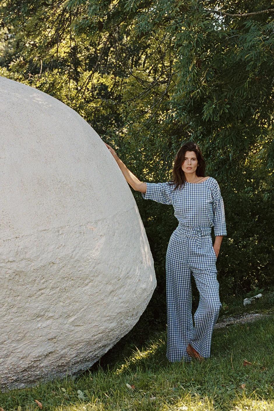 • Cintura engomada y cierre con botón. • Bolsillos insertados en costura. • Tejido fluido con mezcla de algodón-lino-viscosa en cuadro vichy. • Línea A: Diseñado para llevar una silueta acampanada. • Medidas sobre talla 36 en plano. Cintura: 33,5cm Largo de tiro: 32cm. Largo de entrepierna: 75cm.