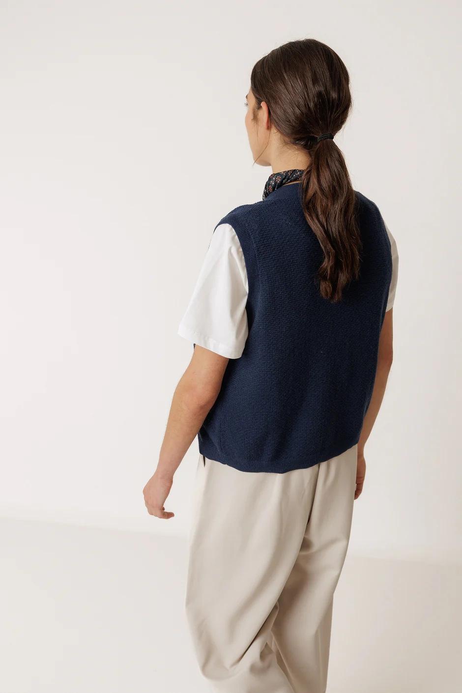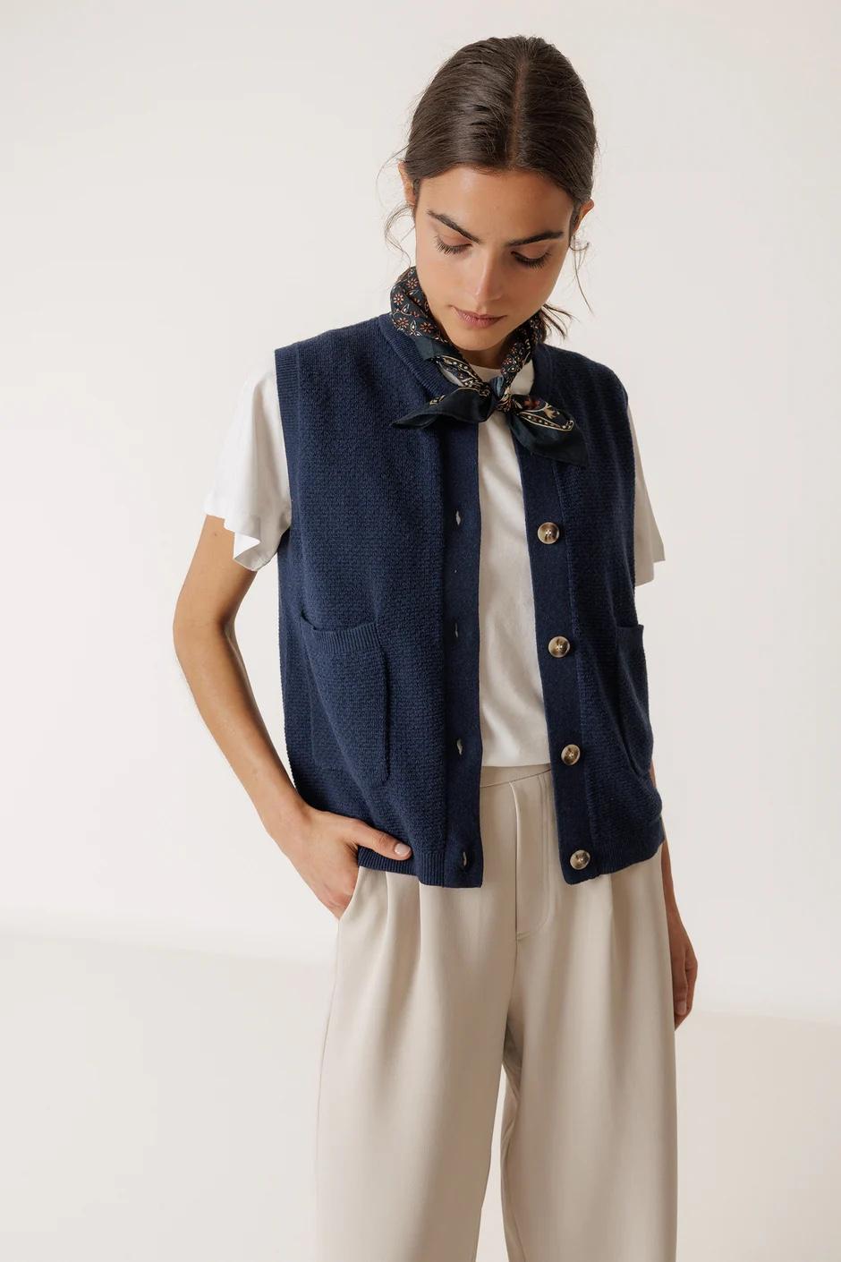 Este chaleco de cuello caja y botonadura central, está tejido en punto de arroz. Además es de Seawool (lana de mar), una fibra textil revolucionaria creada a través de conchas de ostras y botellas de plástico.