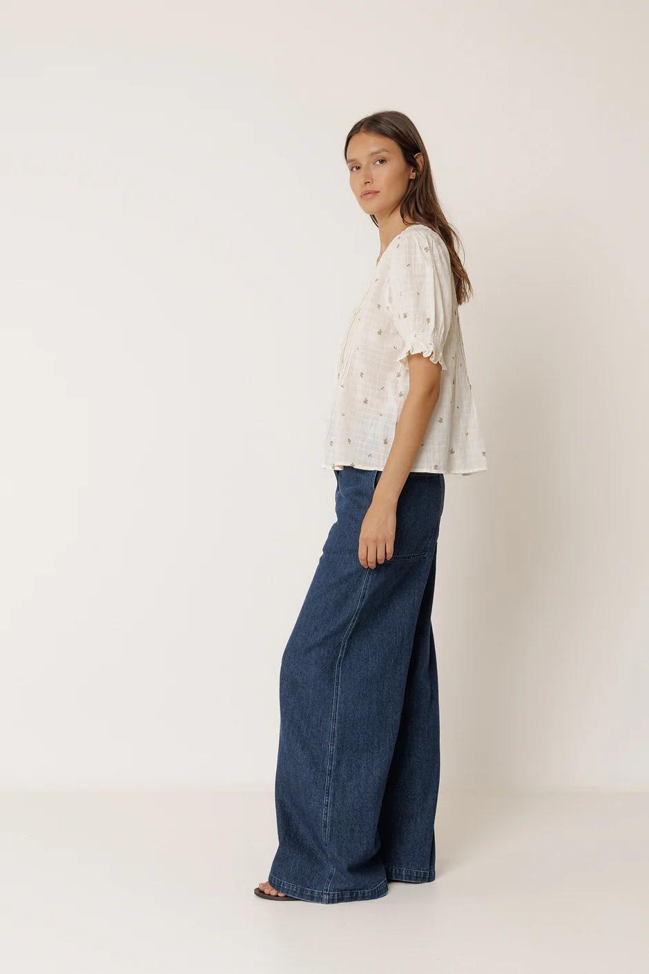Una camisa llena de detalles. Tiene mangas globo engomadas, escote en pico y jaretas en el talle con una silueta súper femenina. Está confeccionada sobre un dobby de algodón de estampado tipo sello con motivo floral.