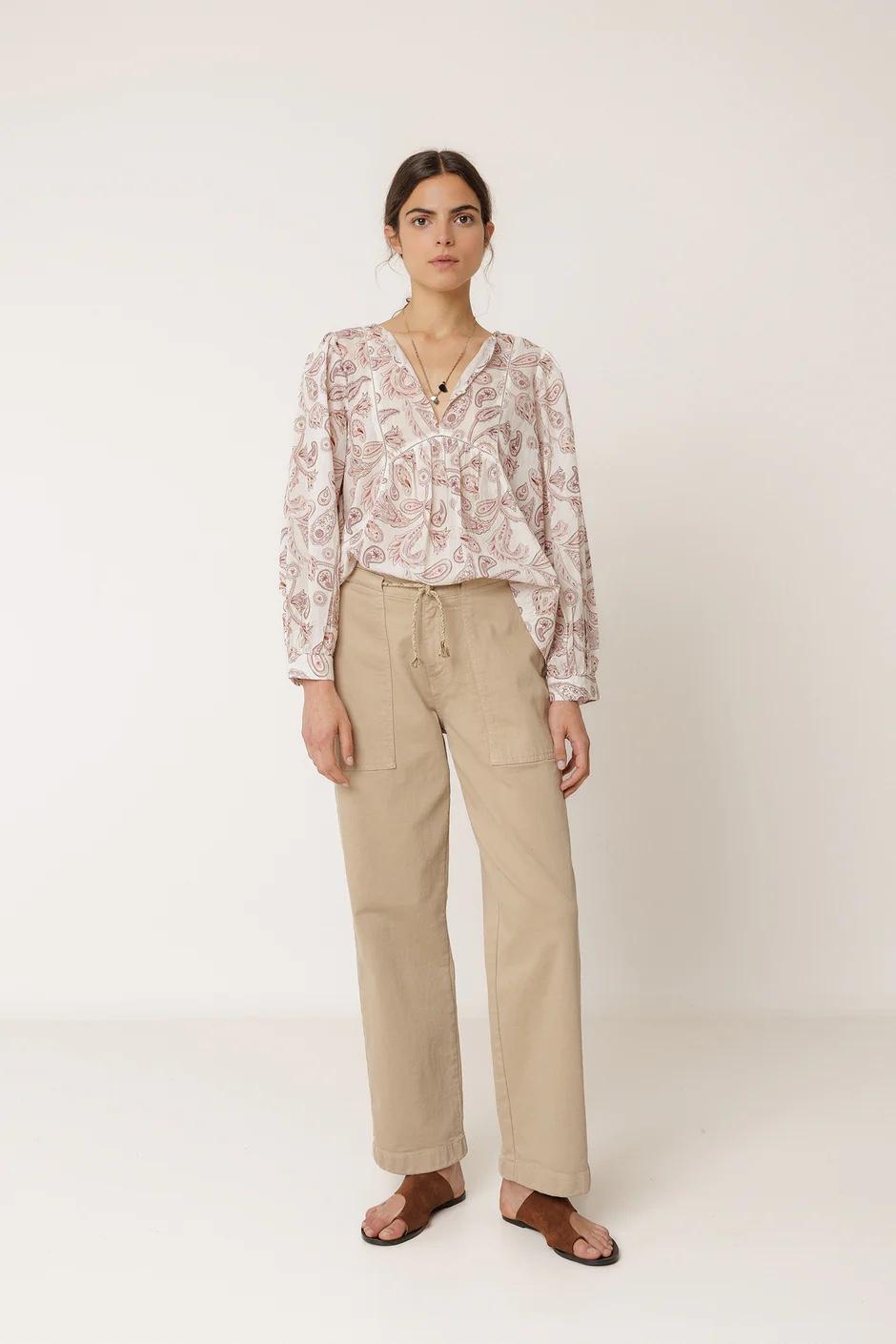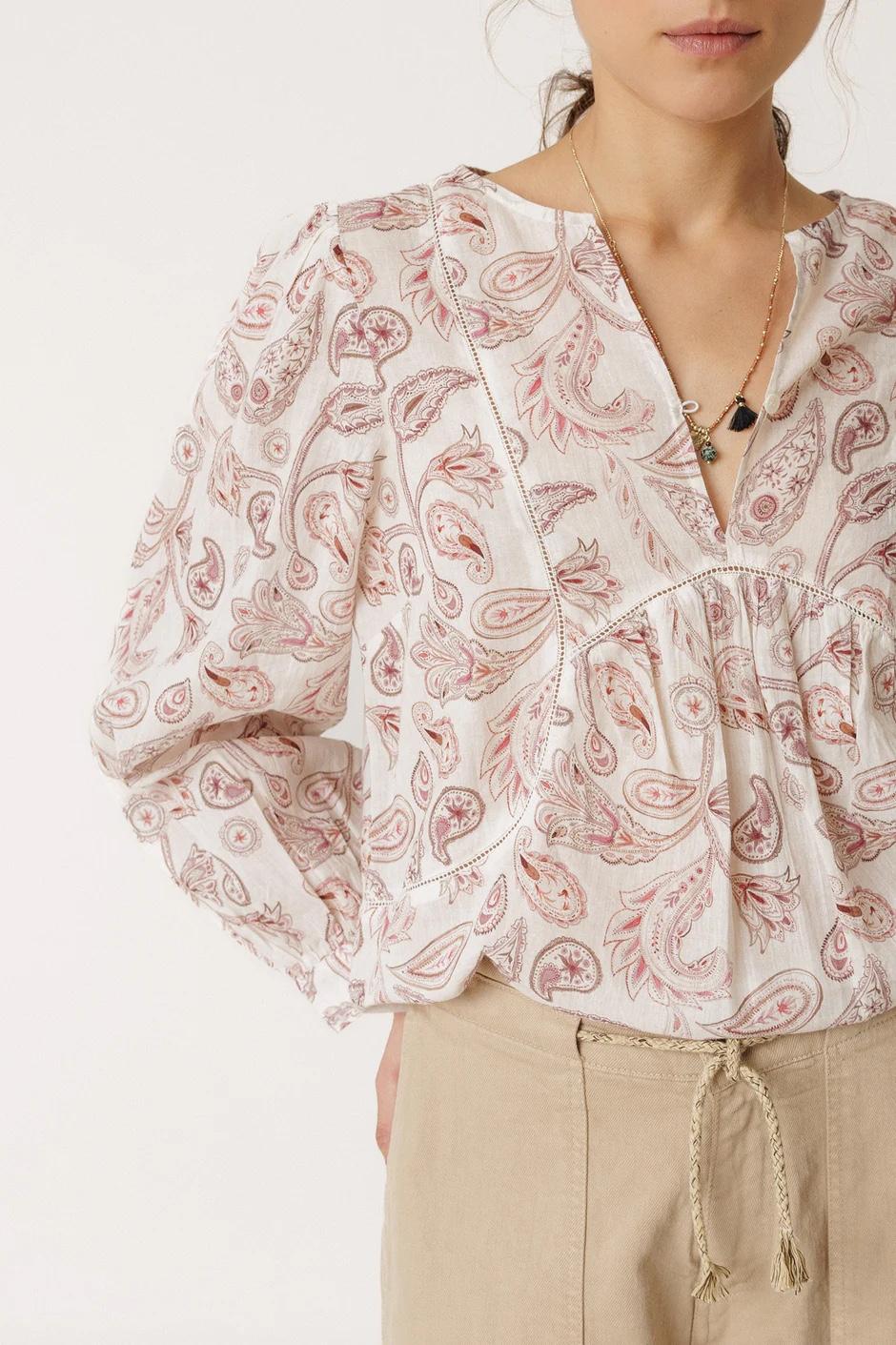 • Hombro encajado y manga larga con puño y cierre de botón • Cuello redondo acabado en V con cierre de botón. • Detalles de vainicas en el talle sobre un tejido de algodón orgánico. • Estampados paisley y étnico. • Fit regular: Diseñado para llevar un fit estándar • Medidas sobre talla S en plano: Largo desde hombro 64cm. Ancho de pecho 49cm. Ancho de bajo 58cm. Tallaje: +1 cm de largo por talla y +2cm en contornos.