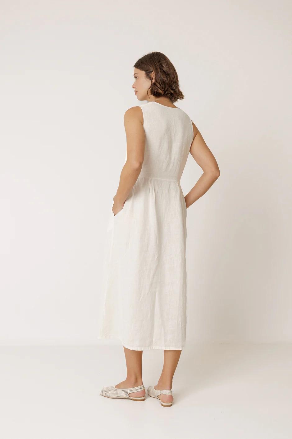 Escote en V o cuello en caja: multiposición. • Hombro encajado • Cierre de botonadura. • Corte en cintura y detalle de pliegues. • Tejido 100% en lino. • Bolsillo insertado en costura. • Fit relajado: Diseñado para que siente ligeramente holgado. • Medidas sobre talla S en plano: Largo desde hombro 125cm. Ancho de pecho 45cm. Ancho de bajo 84cm. Tallaje: +1 cm de largo por talla y +2cm en contornos.