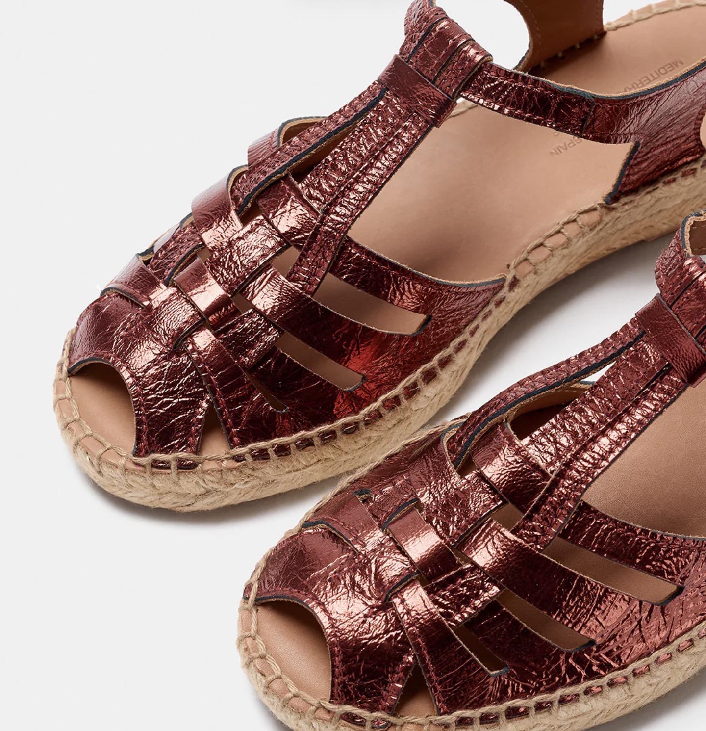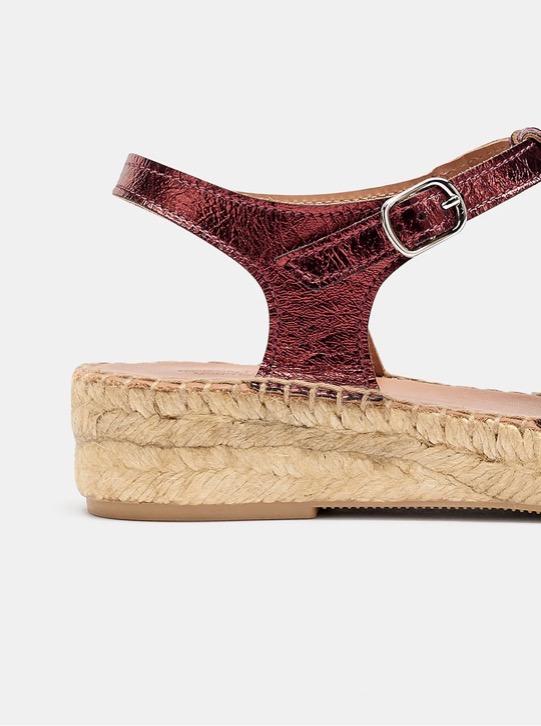 Bemol es un clásico de Naguisa, una sandalia cangrejera de tiras finas en T que se ajusta al tobillo con una hebilla. Los cortes son en piel ovina con lámina metalizada. Forro de piel. La planta es acolchada con foam y forrada de piel vacuna natural para dejar transpirar mejor tu pie. El piso está hecho con trenza de yute, una pequeña cuña para mayor comodidad y suela de goma antideslizante. La altura total es de 3 cm. Fabricado en España.