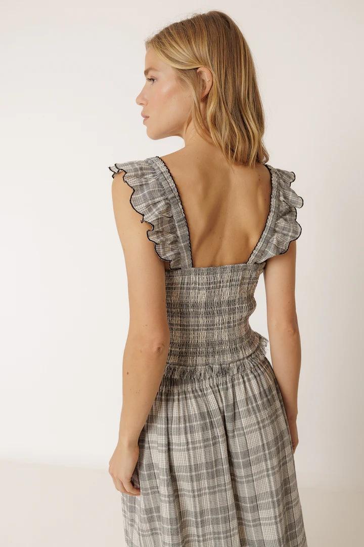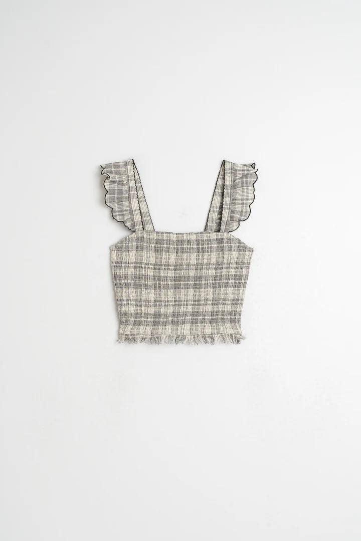 El volante ondulado aporta movimiento y feminidad, mientras que el cuadro y la estructura lo convierten en una prenda especial. ¡Lo puedes acompañar con la falda de la misma serie y crear un total look!