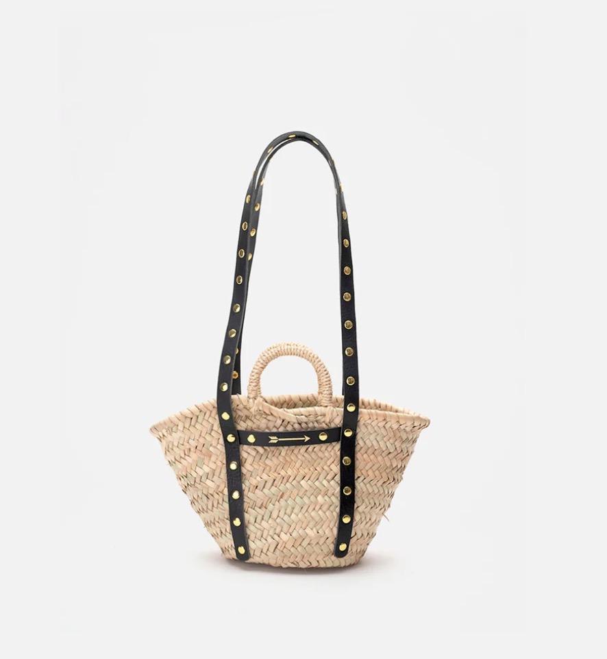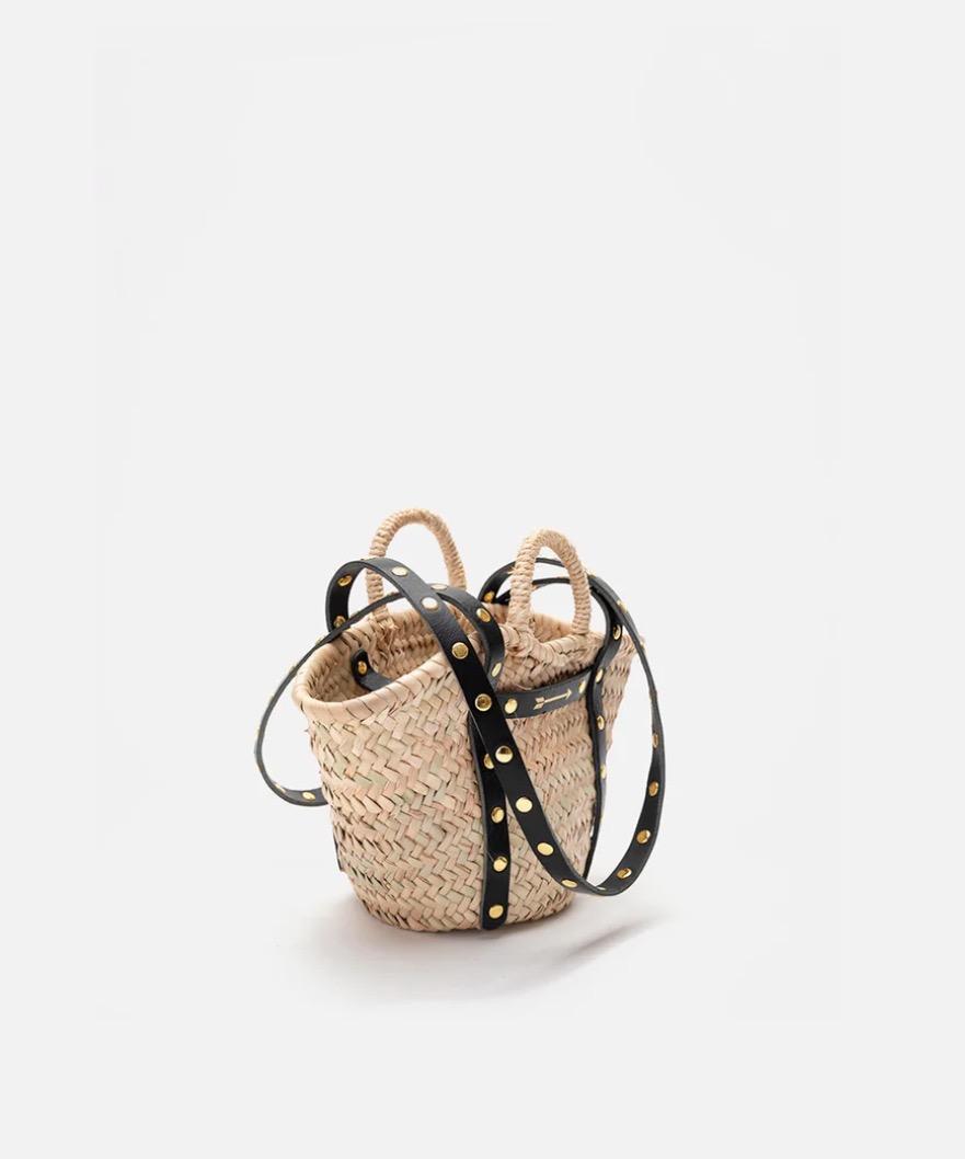 Bolso capazo con Capazo pequeño hecho de hojas de palma y asas de piel largas y resistentes que garantizan comodidad y durabilidad en cada uso. Con tachuelas en las asas para darle un toque diferente a cualquier look de verano.