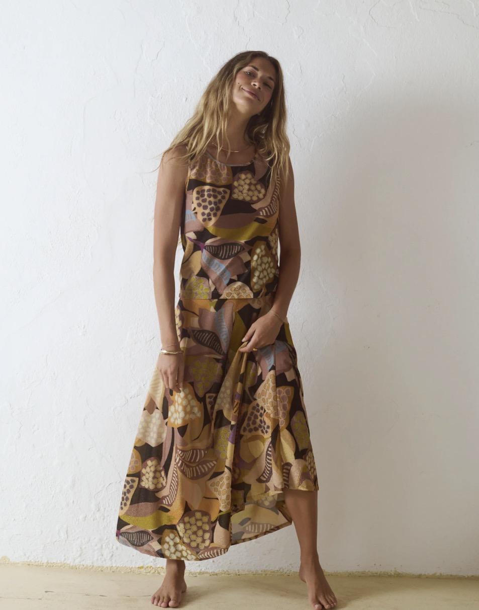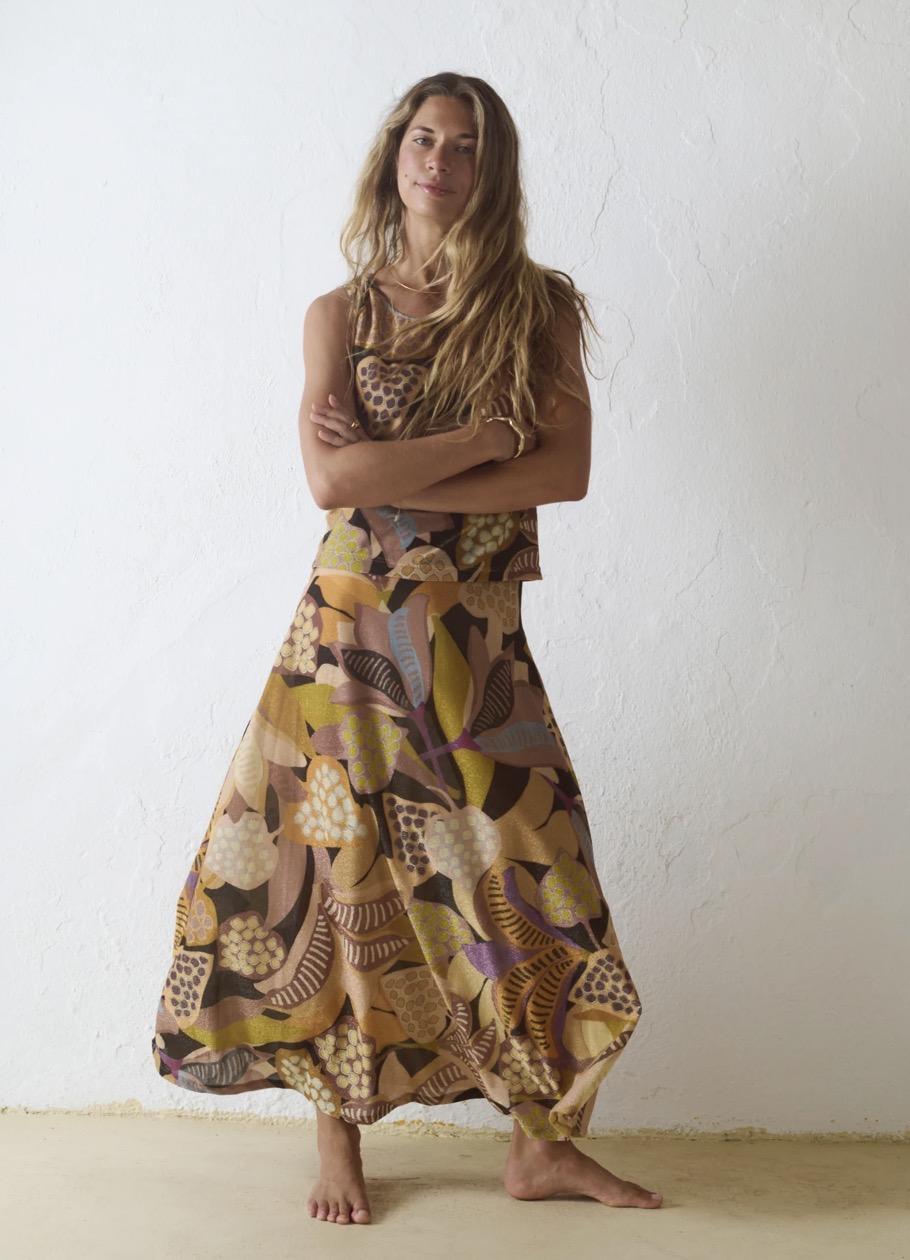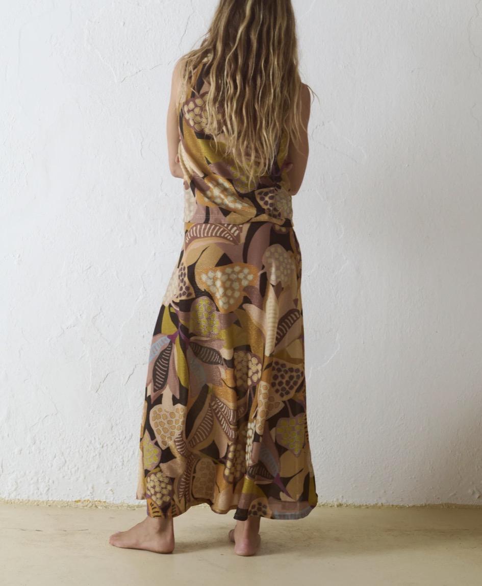 Falda larga con estampado gráfico de inspiración orgánica. El print combina formas abstractas y motivos geométricos. La paleta cromática se construye a partir de tonos tierra, mostaza, marrón, malva y negro, con acentos más claros que aportan contraste y ritmo al conjunto.