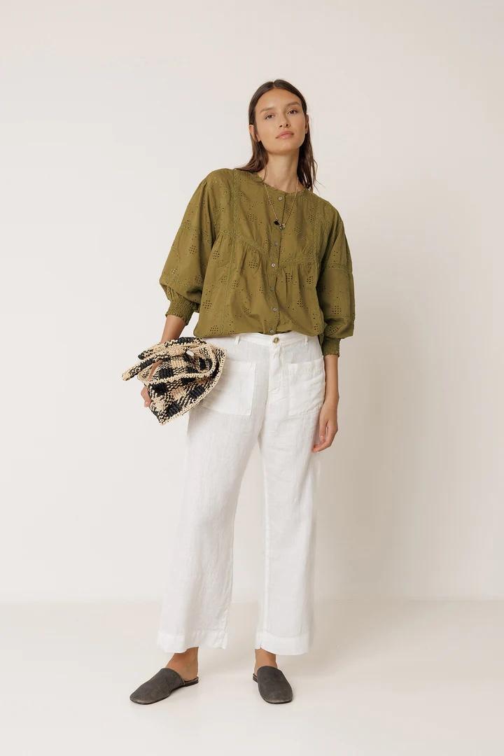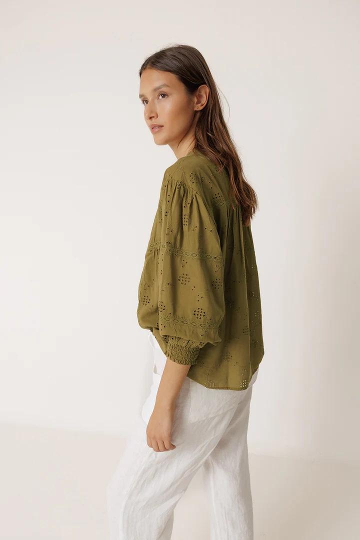 Camisa de manga larga en voile de algodón, puro ADN Indi. Cuello con micro volante, puntilla insertada en el talle y en las mangas. Bordado suizo que hace de esta prenda un must de la temporada.