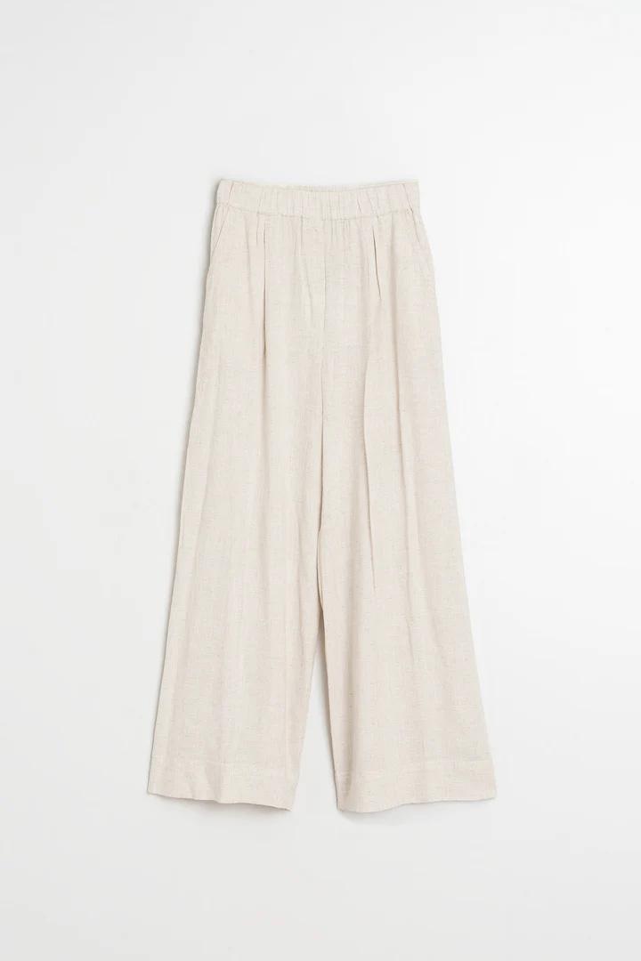 • Tiro alto con cinturilla engomada. • Bolsillo francés. • Tejido de viscosa con lino. • Pinzas delanteras. • Pernera ancha. • Fit relajado: Diseñado para que siente ligeramente holgado. • Medidas sobre talla 36 en plano. Cintura: 34cm. Largo de tiro: 29,5cm. Largo de entrepierna: 78cm.